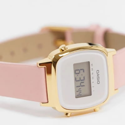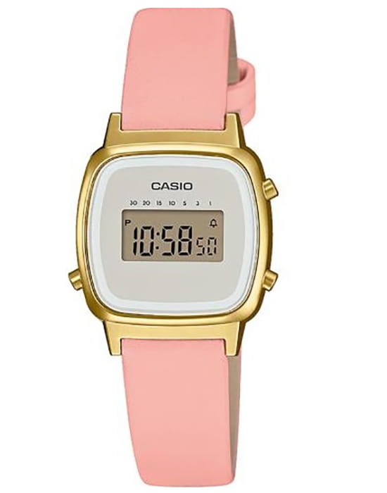 Модель с квадратным компактным корпусом отображает время в цифровом формате. Часы Vintage Mini дополнены розовым ремешком из натуральной кожи. Такое исполнение стильно смотрится на изящном запястье. Японский кварцевый механизм работает от батарейки, рассчитанной на 2 года службы. Циферблат защищён акриловым стеклом, устойчивым к ударам. Золотистый корпус из полимерного материала. Автоматический календарь, 7 таймеров, будильник, секундомер с точностью до 1/10 доли секунды. Габариты: 24,6 x 30,3 x 7,3 мм.