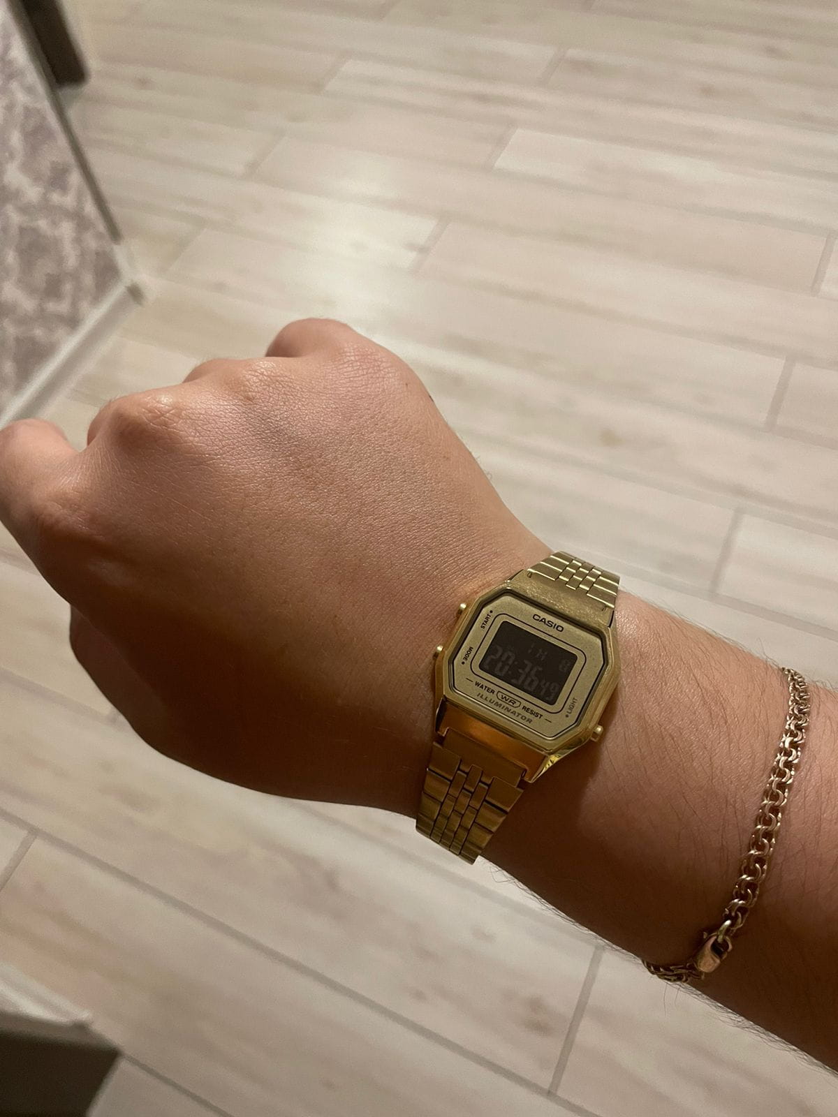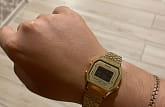 Электронные часы Casio Vintage LA680WGA-9B в ретро стиле. Браслет из стали с IP-покрытиемIP-покрытиеМетод ионного напыления. Демонстрирует повышенную устойчивость к истиранию, окислению и химическим веществам. Под воздействием высокого давления и температуры около 1500°C молекулы металла надёжно соединяются с частицами корпуса часов.. Водостойкость WR 30, 30 метров, позволит защитить корпус от случайных брызг или капель дождя. Циферблат подсвечивается светодиодомСветодиодная подсветкаСветодиодная или LED-подсветка обеспечивает появление яркого холодного свечения за счёт LED-элементов - маленьких лампочек. Они потребляют минимальное количество энергии, чаще всего можно встретить 1 светодиод, в нижней части циферблата.. СекундомерСекундомерСекундоме́р — прибор, способный измерять интервалы времени с точностью до долей секунды. с точностью показаний 1/100с и временем измерения 1ч. Сплит-хронографСплит-хронографИспользуется для измерения продолжительности нескольких временных отрезков, начинающихся одновременно, а заканчивающихся в разное время.. Батарея рассчитана на 5 лет. Задняя крышка крепится на 4-х винтах.
