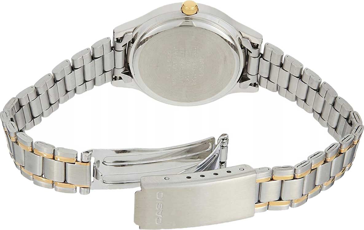 Японские кварцевые женские часы из коллекции LTP с минеральным стекломМинеральное стеклоМинеральное стекло представляет собой искусственно выращенный минерал кварца. Такое стекло отличается особой устойчивостью к повреждениям и царапинам. Уступает по некоторым качествам сапфировому стеклу. Casio Collection LTP-1128G-9A изящно смотрятся на запястье, они привлекают классическим исполнением и правильной геометрией. Минималистичная модель станет отличным решением для любого случая: на работу, переговоры с деловыми партнёрами, прогулку с друзьями или праздничный вечер. Отсутствуют лишние детали, что позволяет часам быть актуальными на долгие годы. Корпус и браслет выполнен из нержавеющей стали с частичным IP-покрытиемIP-покрытиеМетод ионного напыления. Демонстрирует повышенную устойчивость к истиранию, окислению и химическим веществам. Под воздействием высокого давления и температуры около 1500°C молекулы металла надёжно соединяются с частицами корпуса часов.. Стальной браслет на раскладной застёжкеРаскладная застёжкаТакой тип застёжки используется только на браслетах из металла. Она никогда не раскрывается полностью, происходит разделение на 2 и более частей. Раскладывающая застёжка снизит вероятность потери часов к минимуму.. Циферблат с метками в виде штрихов выполнен по технологии Sunray (солнечные лучи)