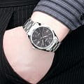 Стильный аксессуар станет лучшим вариантом на каждый день. На чёрном циферблате идеально выделяются контрастные серебристые метки и стрелки, обеспечивая отличную читаемость показателей времени. Элегантности прибавляет фигурный безельБезельВнешний ободок, закрепляющий стекло. В спортивных часах так называется поворотное кольцо с делениями на циферблате, выполняет роль таймера – замеряет отрезки времени на шкале. Неподвижный безель – элемент декора. Однонаправленно вращающийся безель на дайверских часах позволяет фиксировать моменты погружения и выныривания на поверхность.. Кварцевый механизм японского производства работает от батарейки, срок службы которой составляет 3 года. Корпус и браслет из надёжной хирургической стали.Стальной браслет на раскладной застёжкеРаскладная застёжкаТакой тип застёжки используется только на браслетах из металла. Она никогда не раскрывается полностью, происходит разделение на 2 и более частей. Раскладывающая застёжка снизит вероятность потери часов к минимуму.. Минеральное стеклоМинеральное стеклоМинеральное стекло представляет собой искусственно выращенный минерал кварца. Такое стекло отличается особой устойчивостью к повреждениям и царапинам. Уступает по некоторым качествам сапфировому стеклу.. Стрелки с люминесцентной подсветкойЛюминесцентное покрытиеПозволяет считывать показания времени в темноте. Производители наносят на стрелки, часовые индексы, безель или поверхность циферблата светонакопительный состав, дающий холодное свечение.. Водостойкость 50 метров, позволит защитить корпус от случайных брызг или капель дождя. Окошко даты находится в положении 3 часа.Габариты: 44,2x38,5мм x 9,2мм, вес 113г