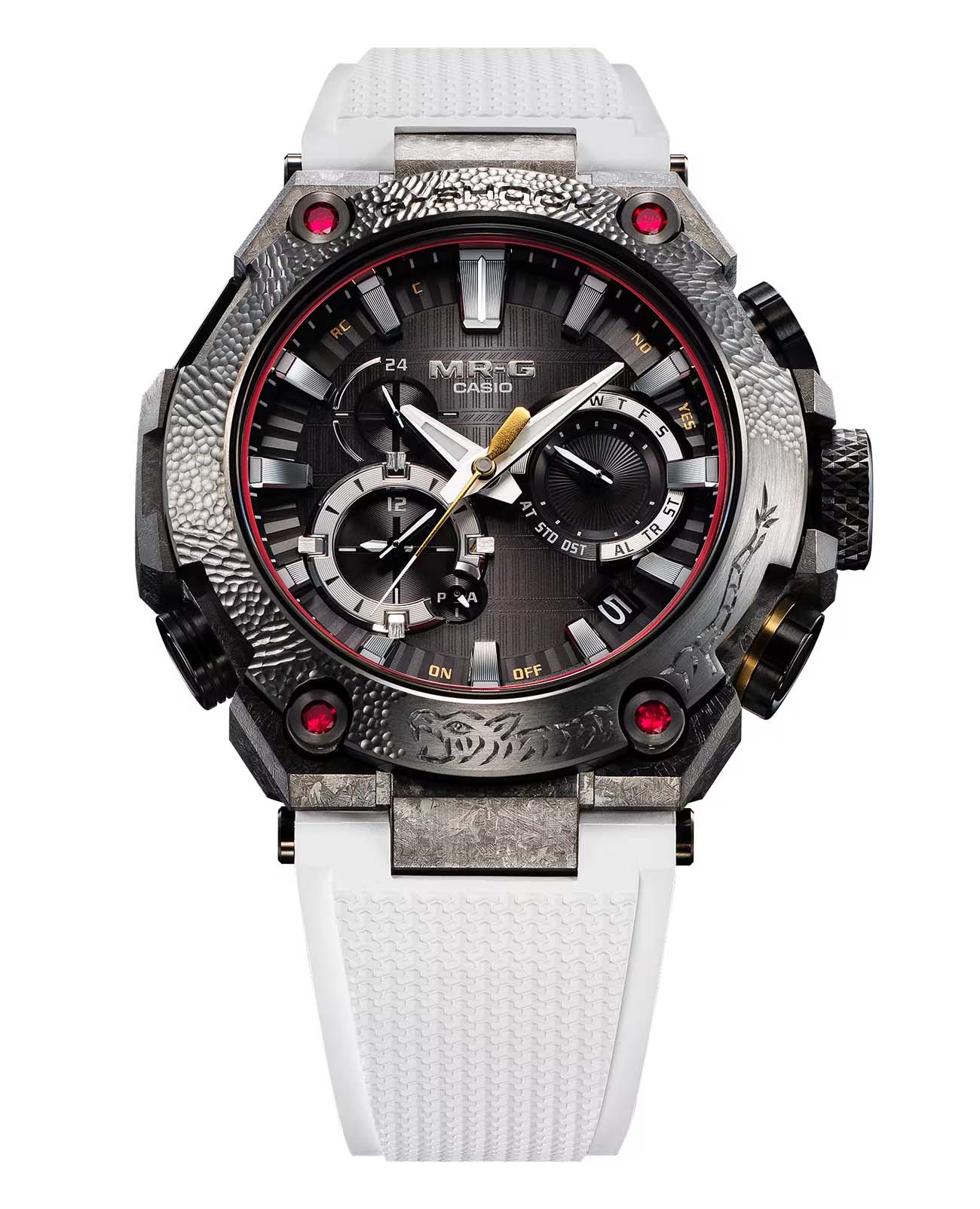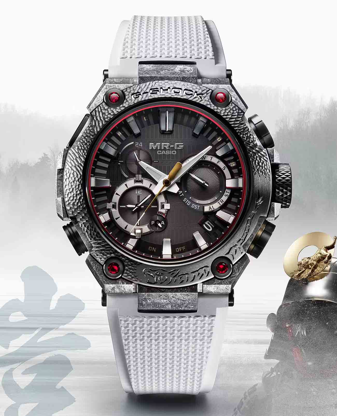 Японские мужские часы Casio G-Shock MRG-B2000SG-1A – дань богатой на легенды и события истории Японии. Восславляя мастерство древних японских ремесленников, эти потрясающие часы успешно воплощают дух самураев, легендарных и искусных воинов. Одновременно с этим, модель инкорпорирует в свой облик знаменитый кабуто-шлем Shougeki-Maru: Gai, который был изготовлен Casio специально для линейки MR-G. Кабуто — это японский боевой шлем, который использовался самураями в период эдо, и считался крайне важным элементом экипировки, а также символом чести и силы. На безелеБезельВнешний ободок, закрепляющий стекло. В спортивных часах так называется поворотное кольцо с делениями на циферблате, выполняет роль таймера – замеряет отрезки времени на шкале. Неподвижный безель – элемент декора. Однонаправленно вращающийся безель на дайверских часах позволяет фиксировать моменты погружения и выныривания на поверхность. с DLC-покрытиемDLC-покрытиеDiamond like carbon - одно из лучших видов покрытия, представляющее собой углерод с алмазными свойствами. На поверхность материала наносятся распавшиеся молекулы углерода, превращающиеся в плёнку из алмазоподобных связей, которая перенимает твёрдость алмаза. изображен золотой гребень этого совершенно особенного шлема с рисунком в виде тигра и каменнозернистым рельефом, искусно выгравированным мастером по металлу Кобаяси Масао. Все часы ограниченной серии - единственные в своем роде, с ручной гравировкой, выполненной мастером-изготовителем. Ударопрочный корпусУдаропрочный корпусМеханизм заключён в корпус, выполненный из современных материалов, устойчивых к ударам, механическим повреждениям и падению с высоты: инновационный пластик, карбон, нержавеющая сталь, титан. защищает механизм от ударов и вибрации.Сапфировое стеклоСапфировое стеклоПрочный и надёжный материал из кристалла сапфира синтетического происхождения, характеризующийся особой твёрдостью и устойчивостью к царапинам и повреждениям. устойчивое к появлению царапин, обладающее высокой прозрачностью. Светодиодная подсветкаСветодиодная подсветкаСветодиодная или LED-подсветка обеспечивает появление яркого холодного свечения за счёт LED-элементов - маленьких лампочек. Они потребляют минимальное количество энергии, чаще всего можно встретить 1 светодиод, в нижней части циферблата. (Super Illuminator), послесвечение. Двойное время, 27 часовых поясов, смена времени в домашнем городе, автоматическое переключение летнего времени (DST). 12/24-часовой формат. Вечный календарьВечный календарьКлассическое часовое усложнение, представляющее собой календарь, рассчитанный на несколько лет вперёд (стандартно – до 2099 года). Определяет текущую дату, день недели, месяц.. СекундомерСекундомерСекундоме́р — прибор, способный измерять интервалы времени с точностью до долей секунды.. ТаймерТаймерОтсчитывает секунды в обратном направлении в заданном интервале времени.. Ежедневный будильник. Автоматическая коррекция исходного положения стрелки. Класс водозащиты: 200 метров, позволит плавать, нырять и заниматься другими водными видами спорта. Ремешок из полимерного материала на раскладной застёжкеРаскладная застёжкаТакой тип застёжки используется только на браслетах из металла. Она никогда не раскрывается полностью, происходит разделение на 2 и более частей. Раскладывающая застёжка сн