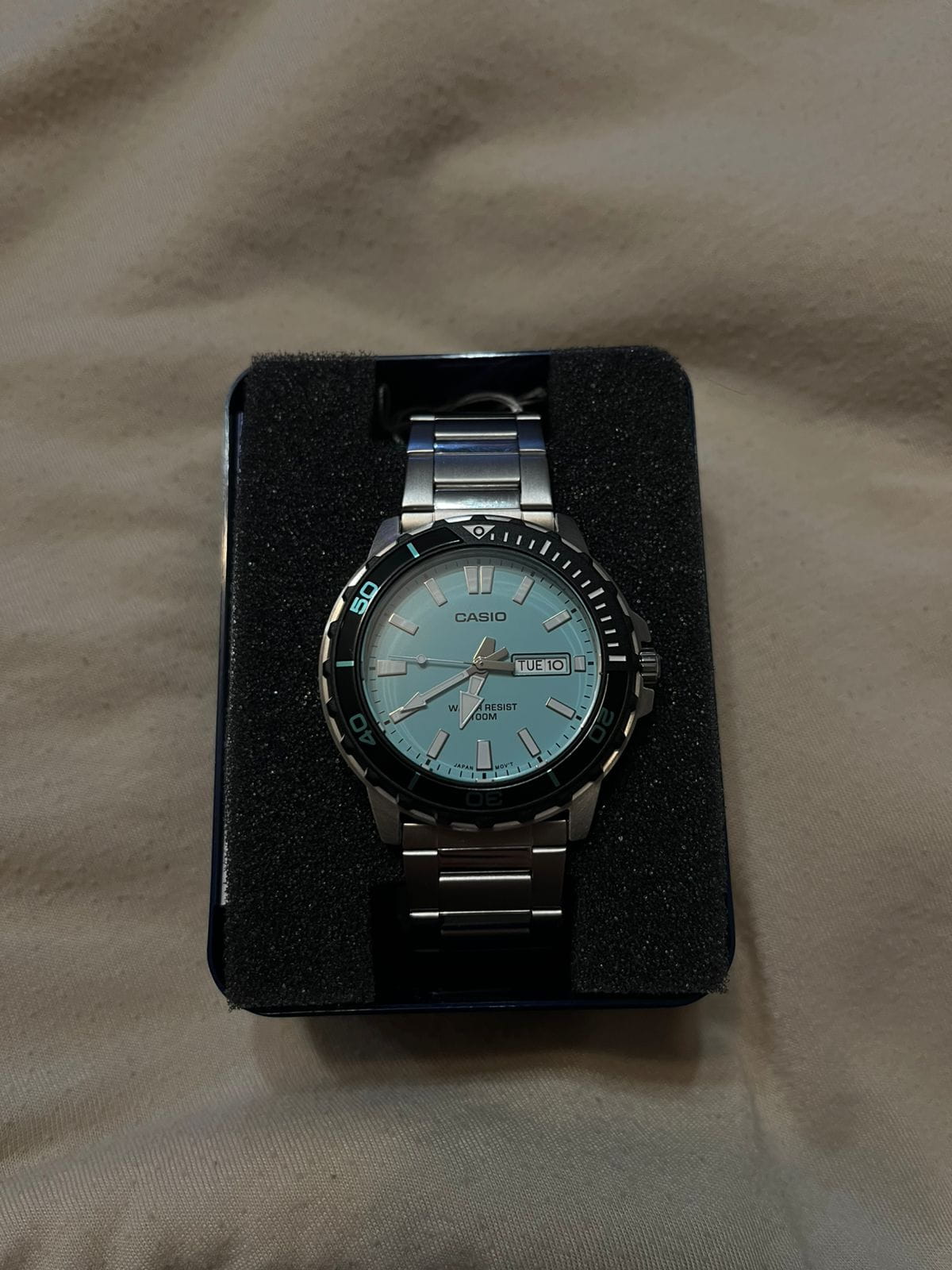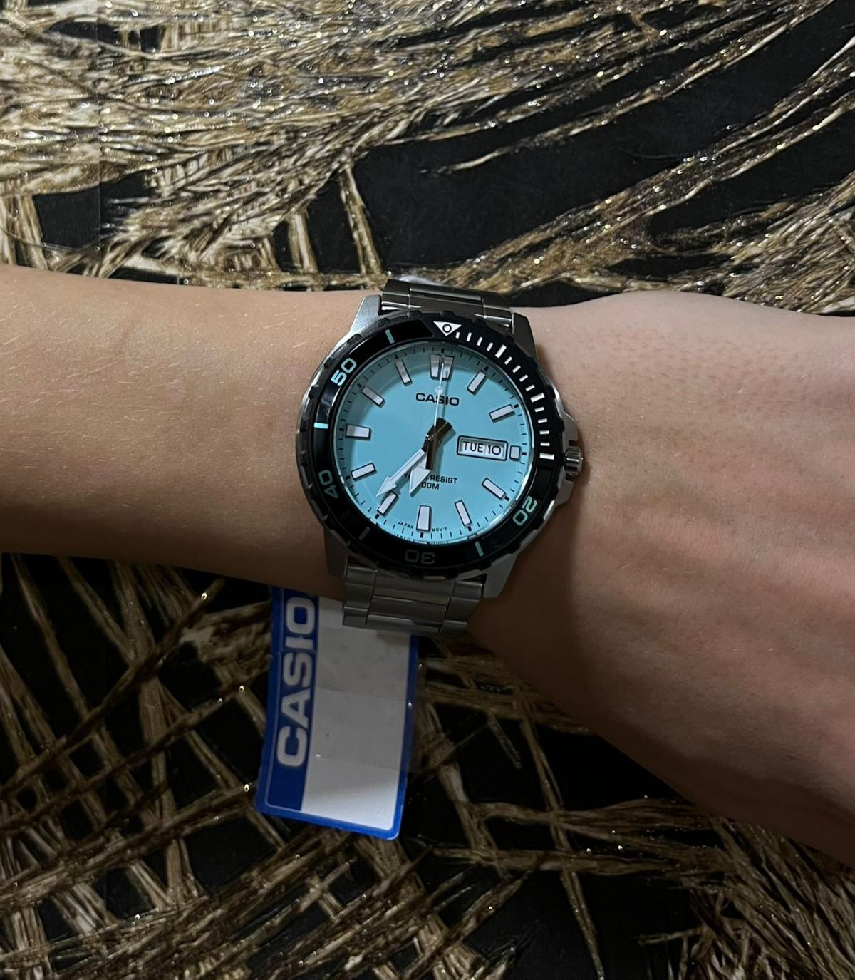 Casio MTD-125D-2A2 – стильные мужские часы, идеально подходящие для активного образа жизни. Корпус диаметром 46,5 × 45,6 × 10,4 мм выполнен из нержавеющей стали, что гарантирует прочность и долговечность. Бирюзовый циферблат защищён минеральным стекломМинеральное стеклоМинеральное стекло представляет собой искусственно выращенный минерал кварца. Такое стекло отличается особой устойчивостью к повреждениям и царапинам. Уступает по некоторым качествам сапфировому стеклу., устойчивым к царапинам и механическим повреждениям. Часы оснащены кварцевым механизмом с высокой точностью хода и функцией отображения дня недели и даты, где день недели доступен на английском и испанском языках. Браслет из нержавеющей стали дополнен раскладной застёжкойРаскладная застёжкаТакой тип застёжки используется только на браслетах из металла. Она никогда не раскрывается полностью, происходит разделение на 2 и более частей. Раскладывающая застёжка снизит вероятность потери часов к минимуму., обеспечивающей удобную фиксацию на запястье. Водонепроницаемость 10 бар (100 метров) делает модель надёжным спутником для плавания и других водных активностей.