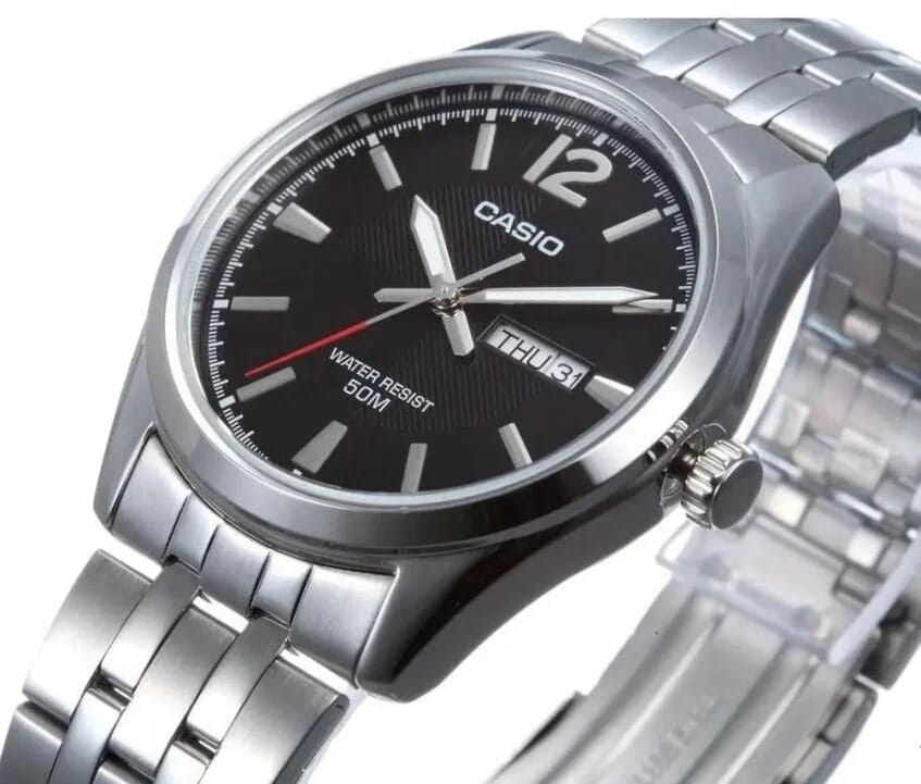 Японские мужские часы с минеральным стекломМинеральное стеклоМинеральное стекло представляет собой искусственно выращенный минерал кварца. Такое стекло отличается особой устойчивостью к повреждениям и царапинам. Уступает по некоторым качествам сапфировому стеклу. Casio MTP-1335D-1A, кварцевый механизм с высокой точностью. Класс водозащиты: 50 метров, позволит защитить корпус от случайных брызг или капель дождя. Корпус часов изготовлен из стали. Стальной браслет на раскладной застёжкеРаскладная застёжкаТакой тип застёжки используется только на браслетах из металла. Она никогда не раскрывается полностью, происходит разделение на 2 и более частей. Раскладывающая застёжка снизит вероятность потери часов к минимуму.. Стрелки с люминесцентным покрытиемЛюминесцентное покрытиеПозволяет считывать показания времени в темноте. Производители наносят на стрелки, часовые индексы, безель или поверхность циферблата светонакопительный состав, дающий холодное свечение.. Окошки дня недели и даты находятся в положении 3 часа.