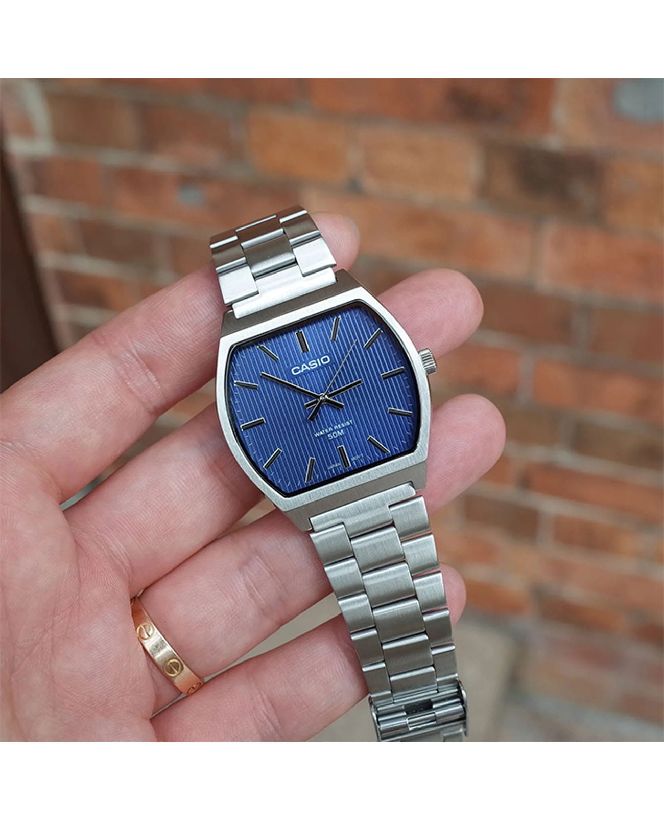Японские мужские часы с минеральным стекломМинеральное стеклоМинеральное стекло представляет собой искусственно выращенный минерал кварца. Такое стекло отличается особой устойчивостью к повреждениям и царапинам. Уступает по некоторым качествам сапфировому стеклу. Casio Collection MTP-B140D-2A, кварцевый механизм с высокой точностью. Корпус часов изготовлен из стали. Циферблат с метками в виде штрихов. Батарея рассчитана на 3 года. Класс водозащиты: 50 метров, позволит защитить корпус от случайных брызг или капель дождя Стальной браслет на раскладной застёжкеРаскладная застёжкаТакой тип застёжки используется только на браслетах из металла. Она никогда не раскрывается полностью, происходит разделение на 2 и более частей. Раскладывающая застёжка снизит вероятность потери часов к минимуму..