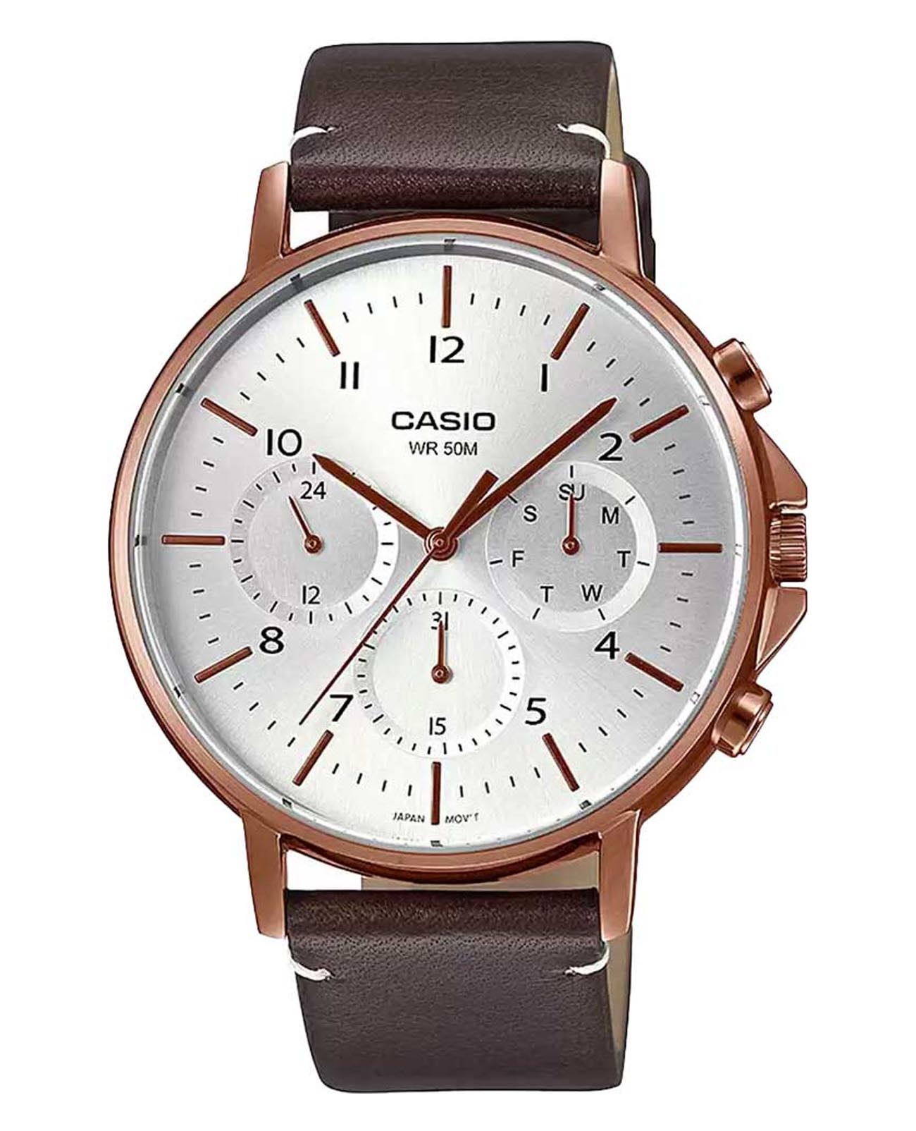 Японские мужские часы с минеральным стекломМинеральное стеклоМинеральное стекло представляет собой искусственно выращенный минерал кварца. Такое стекло отличается особой устойчивостью к повреждениям и царапинам. Уступает по некоторым качествам сапфировому стеклу. Casio Collection MTP-E321RL-5A, кварцевый механизм с высокой точностью. Корпус часов изготовлен из стали с IP-покрытиемIP-покрытиеМетод ионного напыления. Демонстрирует повышенную устойчивость к истиранию, окислению и химическим веществам. Под воздействием высокого давления и температуры около 1500°C молекулы металла надёжно соединяются с частицами корпуса часов.. Циферблат выполнен по технологии Sunray (солнечные лучи). 12-ти и 24-х часовой формат времени, число и день недели вынесены на отдельные циферблаты. Метки в виде штрихов и арабских цифр. Заводная головка с защитой. Батарейка рассчитана на 3 года. Класс водозащиты: 50 метров, позволит защитить корпус от случайных брызг или капель дождя. Кожаный ремешок на стандартной застёжке.