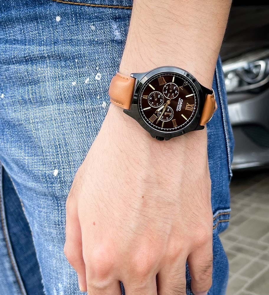 Японские мужские часы с минеральным стекломМинеральное стеклоМинеральное стекло представляет собой искусственно выращенный минерал кварца. Такое стекло отличается особой устойчивостью к повреждениям и царапинам. Уступает по некоторым качествам сапфировому стеклу. Casio Collection MTP-V300B-1A, кварцевый механизм с высокой точностью. Корпус часов изготовлены из стали IP-покрытиемIP-покрытиеМетод ионного напыления. Демонстрирует повышенную устойчивость к истиранию, окислению и химическим веществам. Под воздействием высокого давления и температуры около 1500°C молекулы металла надёжно соединяются с частицами корпуса часов.. Люминесцентная подсветкаЛюминесцентное покрытиеПозволяет считывать показания времени в темноте. Производители наносят на стрелки, часовые индексы, безель или поверхность циферблата светонакопительный состав, дающий холодное свечение. стрелок. Кожаный ремешок на стандартной застёжке. Водозащита: 50 метров, позволит защитить корпус от случайных брызг или капель дождя