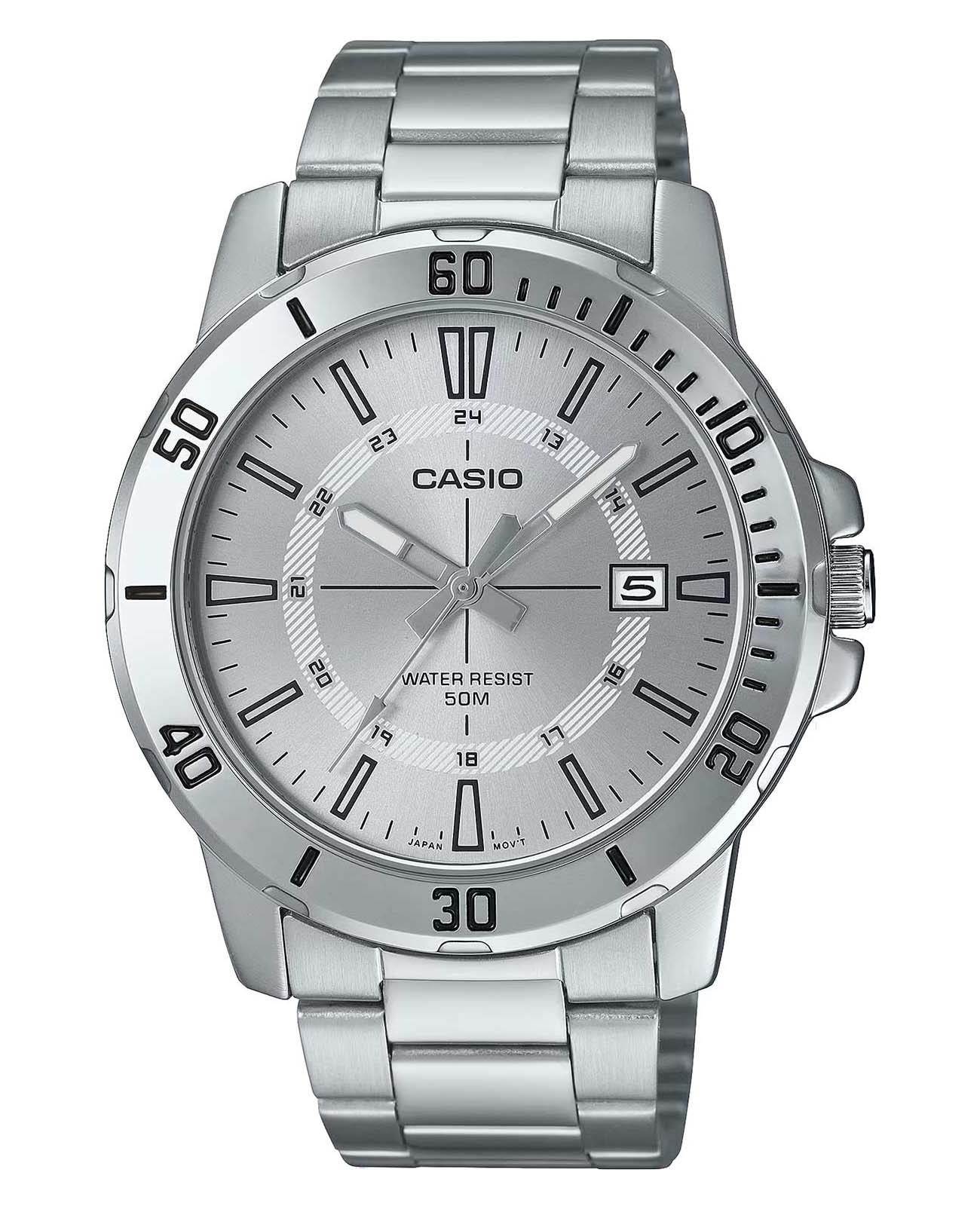 Японские мужские кварцевые часы с минеральным стекломМинеральное стеклоМинеральное стекло представляет собой искусственно выращенный минерал кварца. Такое стекло отличается особой устойчивостью к повреждениям и царапинам. Уступает по некоторым качествам сапфировому стеклу. Casio Collection MTP-VD01D-7CV, кварцевый механизм с высокой точностью. Корпус и браслет часов изготовлен из нержавеющей стали. 12-ти и 24-х часовой формат времени. Циферблат с метками в виде штрихов выполнен по технологии Sunray (солнечные лучи). Стрелки с люминесцентным покрытиемЛюминесцентное покрытиеПозволяет считывать показания времени в темноте. Производители наносят на стрелки, часовые индексы, безель или поверхность циферблата светонакопительный состав, дающий холодное свечение.. Окошко даты находится в положении 3 часа. Заводная головка с защитой. Батарея рассчитана на 3 года. Класс водозащиты: 50 метров, позволит защитить корпус от случайных брызг или капель дождя. Стальной браслет на раскладной застёжкеРаскладная застёжкаТакой тип застёжки используется только на браслетах из металла. Она никогда не раскрывается полностью, происходит разделение на 2 и более частей. Раскладывающая застёжка снизит вероятность потери часов к минимуму..