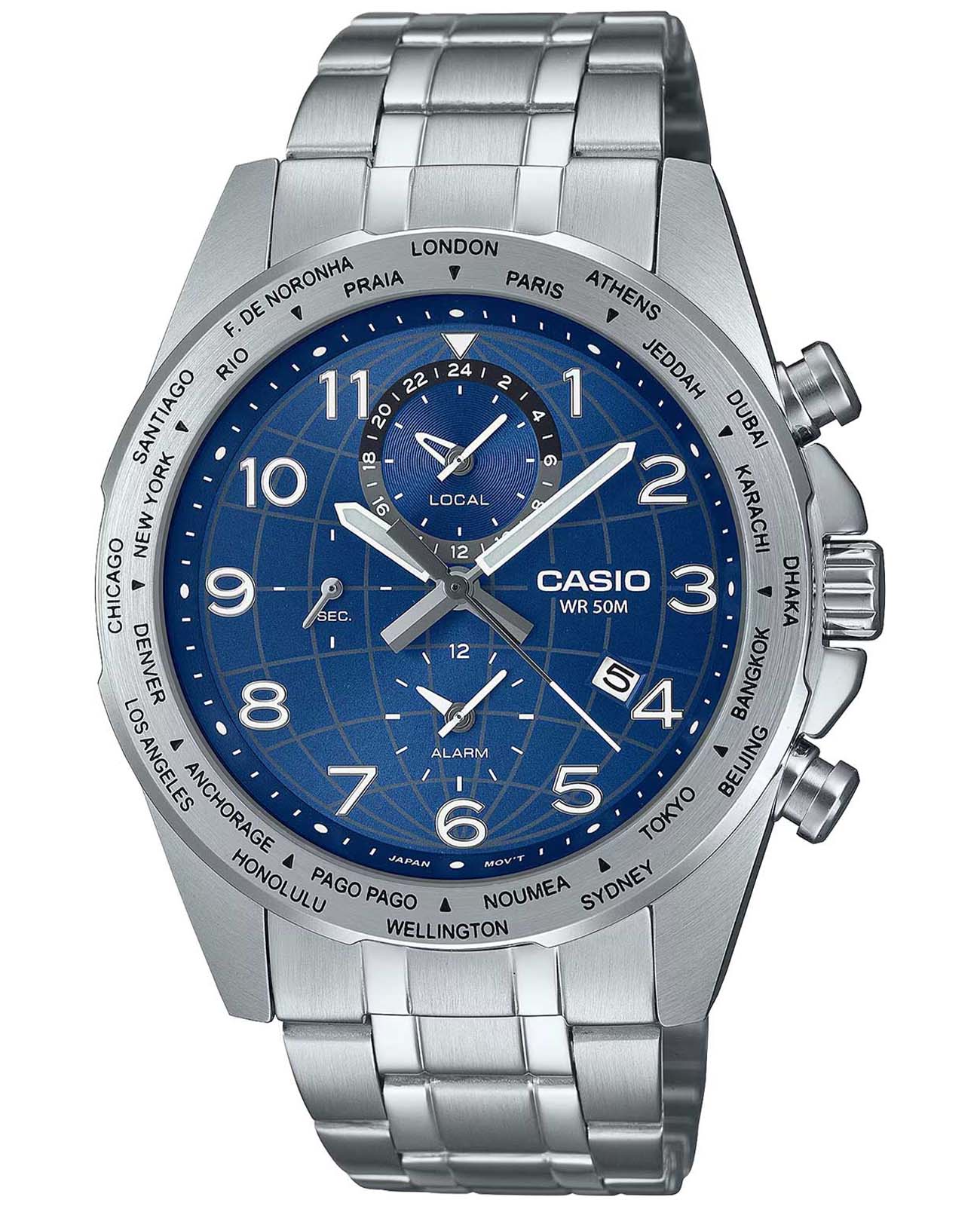Японские мужские часы-хронографХронографФункция позволяет измерять отрезки времени с особой точностью: часы, минуты, секунды. Верным признаком хронографа является наличие на циферблате 3 дополнительных окошек-счётчиков. с секундомеромСекундомерСекундоме́р — прибор, способный измерять интервалы времени с точностью до долей секунды. Casio Collection MTP-W500D-2A, кварцевый механизм с высокой точностью. Класс водозащиты: 50 метров, позволит защитить корпус от случайных брызг или капель дождя. Корпус и браслет часов изготовлены из стали. Удобное отображение времени домашнего часового пояса и мирового времениМировое время Полезное часовое усложнение, отображающее время в основных городах и известных областях по всему миру, оно связано с часовыми поясами, удобно для путешественников и бизнесменов. (24 города - 24 зоны) позволяет ориентироваться при путешествиях. Браслет с раскладной застёжкойРаскладная застёжкаТакой тип застёжки используется только на браслетах из металла. Она никогда не раскрывается полностью, происходит разделение на 2 и более частей. Раскладывающая застёжка снизит вероятность потери часов к минимуму.. БудильникБудильникБуди́льник — часы, в заданный момент времени подающие звуковой, световой и/или в редких случаях другой сигнал./ежечасный сигнал. Минеральное стеклоМинеральное стеклоМинеральное стекло представляет собой искусственно выращенный минерал кварца. Такое стекло отличается особой устойчивостью к повреждениям и царапинам. Уступает по некоторым качествам сапфировому стеклу. устойчивое к мелким механическим повреждениям. Центральные часовая, минутная и секундная стрелки. Индикатор низкого заряда батареи. Синий циферблат с часовыми индексами в виде штрихов и цифр. Стрелки и метки с люминесцентным покрытиемЛюминесцентное покрытиеПозволяет считывать показания времени в темноте. Производители наносят на стрелки, часовые индексы, безель или поверхность циферблата светонакопительный состав, дающий холодное свечение..