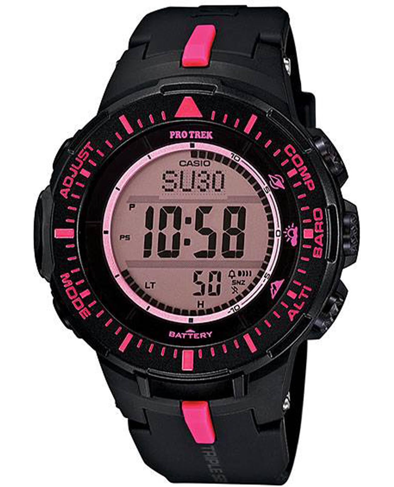 Часы PRG-300-1A4, созданные для любителей активного отдыха. Технология Triple Sensor позволяет точно и легко определять сторону света, температуру и атмосферное давление. Термометр от -10° до +60°С. Барометр - измерение атмосферного давления от 260 до 1100 гПа (от 195 до 825 мм рт. ст.). Встроенный цифровой компас. Высотомер - встроенный датчик барометрического давления с возможностью вывода результатов в единицах высоты над уровнем моря (от -700 до 10000 метров). СекундомерСекундомерСекундоме́р — прибор, способный измерять интервалы времени с точностью до долей секунды. с точностью показаний 1/100с и временем измерения 24ч. Сплит-хронографСплит-хронографИспользуется для измерения продолжительности нескольких временных отрезков, начинающихся одновременно, а заканчивающихся в разное время.. ТаймерТаймерОтсчитывает секунды в обратном направлении в заданном интервале времени. обратного отсчета от 1мин до 1ч. Функция перемещения стрелок. Функция отключения/включения звука. БудильникБудильникБуди́льник — часы, в заданный момент времени подающие звуковой, световой и/или в редких случаях другой сигнал. (5 установок). Минеральное стеклоМинеральное стеклоМинеральное стекло представляет собой искусственно выращенный минерал кварца. Такое стекло отличается особой устойчивостью к повреждениям и царапинам. Уступает по некоторым качествам сапфировому стеклу. устойчиво к появлению царапин. Водонепроницаемость 100 метров, позволит плавать, нырять и заниматься другими водными видами спорта. Светодиодная подсветкаСветодиодная подсветкаСветодиодная или LED-подсветка обеспечивает появление яркого холодного свечения за счёт LED-элементов - маленьких лампочек. Они потребляют минимальное количество энергии, чаще всего можно встретить 1 светодиод, в нижней части циферблата..