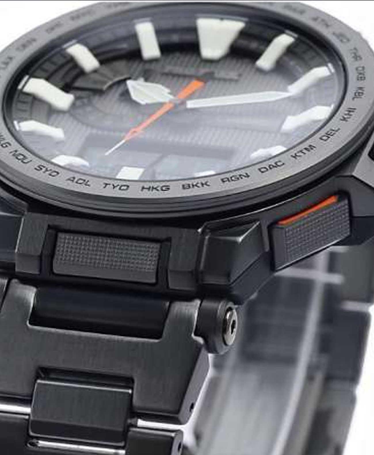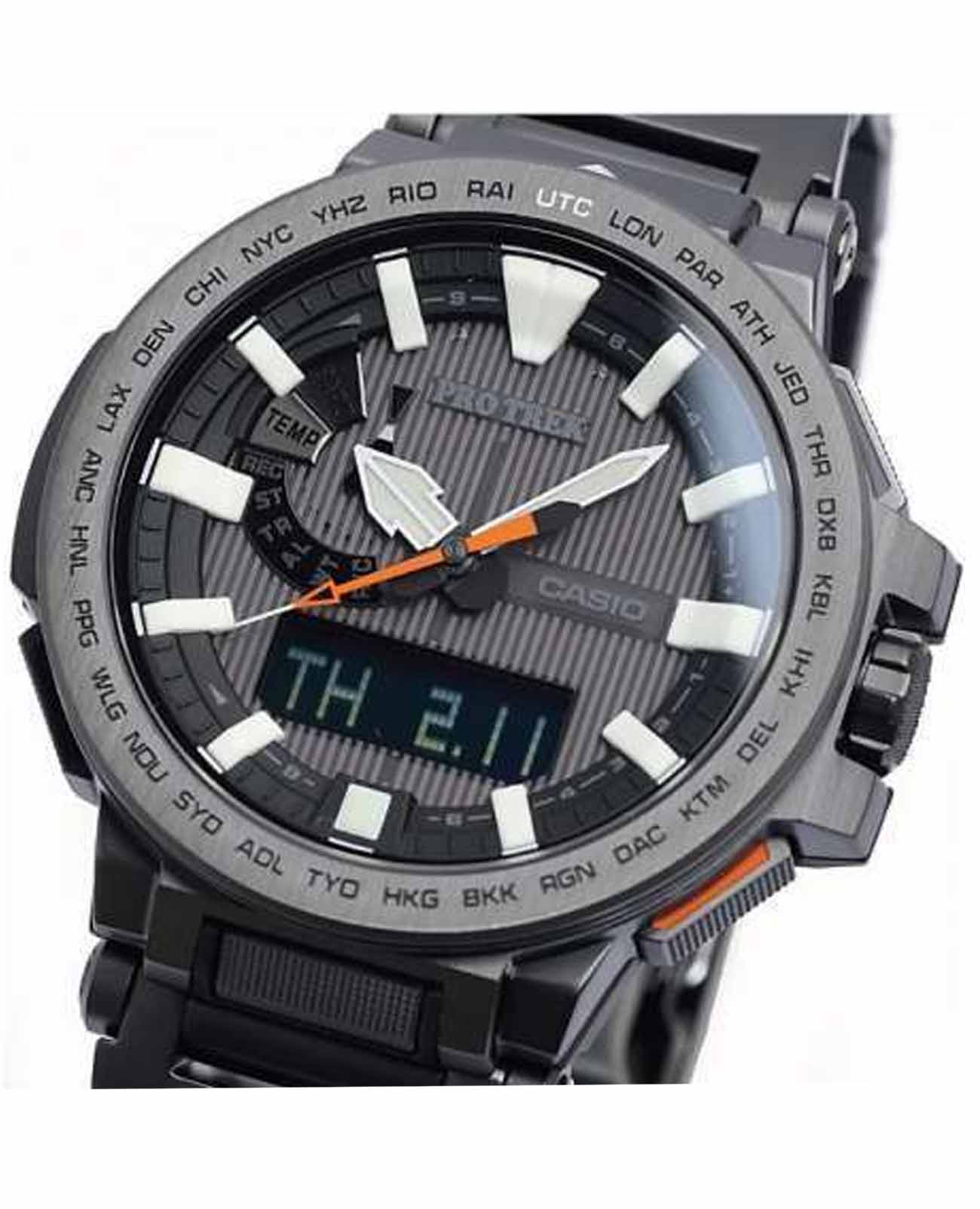 Casio Pro Trek PRX-8000YT-1JF- модель, которая на сегодняшний день считается одной из лучших для занятий профессиональным альпинизмом Сверхнадежные часы отличаются не только премиальным дизайном, богатым набором функций, но и превосходной считываемостью информации, поэтому спокойно могут быть использованы альпинистами даже на высоте 8 километров Самые ключевые детали корпуса этой модели выполнены из высокопрочного сплава титана, который для дополнительной стойкости покрыт слоем карбида титана Корона часов, безель и все кнопки обработаны покрытием DLC (углеродное алмазное вещество) Циферблат со стрелками с двойной люминесцентной обработкой для лучшей видимости в темноте покрыт сверхпрочным сапфировым стеклом PRX-8000YT-1JF имеют максимальную защиту, поэтому не боятся ни ударов, ни вибрации, ни погружения в воду (до 100 метров), ни перепадов температур (до -10°C), да и трудно найти что-то такое, что могло бы их сильно повредить Конечно, при желании можно разбить любые защищенные часы, но в альпинизме, где всякое случается, модель PRX-8000T – это самый надежный помощник, который точно не подведет. Главная функциональная особенность этих часов – это наличие сверхточного датчика Triple Sensor Ver 3. СекундомерСекундомерСекундоме́р — прибор, способный измерять интервалы времени с точностью до долей секунды. с точностью показаний 1/100с и временем измерения 24ч. Сплит-хронографСплит-хронографИспользуется для измерения продолжительности нескольких временных отрезков, начинающихся одновременно, а заканчивающихся в разное время.. ТаймерТаймерОтсчитывает секунды в обратном направлении в заданном интервале времени. обратного отсчета от 1с до 1ч. Мировое времяМировое время Полезное часовое усложнение, отображающее время в основных городах и известных областях по всему миру, оно связано с часовыми поясами, удобно для путешественников и бизнесменов. – 29 городов (29 часовых поясов), всемирное координированное время (UTC). Функция включения/отключения летнего времени. Функция автоматической коррекции положения стрелок проверяет положение стрелок каждый час и корректирует его в случае необходимости. Технология Triple Sensor позволяет точно и легко определять сторону света, температуру и атмосферное давление. Термометр от -10° до +60°С с точностью 0,1°C. Барометр - измерение атмосферного давления от 260 до 1100 гПа (от 195 до 825 мм рт. ст.). Встроенный цифровой компас. Диапазон измерения от 0° до 359° с точностью 1°. Высотомер - встроенный датчик барометрического давления с возможностью вывода результатов в единицах высоты над уровнем моря (от -700 до 10000 метров).