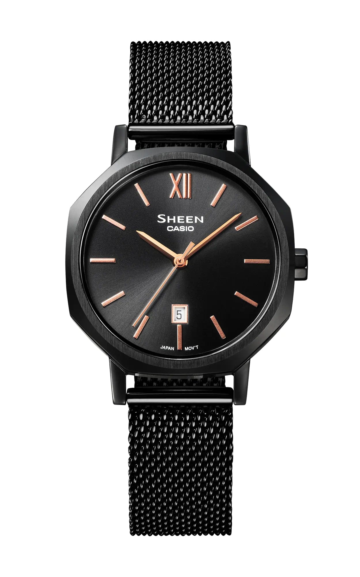 Женские японские часы Casio Sheen SHE-4554BM-1A, кварцевый механизм с высокой точностью. Класс водозащиты: 50 метров, позволит защитить корпус от случайных брызг или капель дождя. Сапфировое стеклоСапфировое стеклоПрочный и надёжный материал из кристалла сапфира синтетического происхождения, характеризующийся особой твёрдостью и устойчивостью к царапинам и повреждениям., защищающее от царапин. Круглый стальной корпус изготовлен из нержавеющей стали c IP покрытиемIP-покрытиеМетод ионного напыления. Демонстрирует повышенную устойчивость к истиранию, окислению и химическим веществам. Под воздействием высокого давления и температуры около 1500°C молекулы металла надёжно соединяются с частицами корпуса часов.. Апертура даты расположена на отметке 6 часов. Стальной миланский браслет c IP покрытиемIP-покрытиеМетод ионного напыления. Демонстрирует повышенную устойчивость к истиранию, окислению и химическим веществам. Под воздействием высокого давления и температуры около 1500°C молекулы металла надёжно соединяются с частицами корпуса часов. имеет раскладную застежкуРаскладная застёжкаТакой тип застёжки используется только на браслетах из металла. Она никогда не раскрывается полностью, происходит разделение на 2 и более частей. Раскладывающая застёжка снизит вероятность потери часов к минимуму.