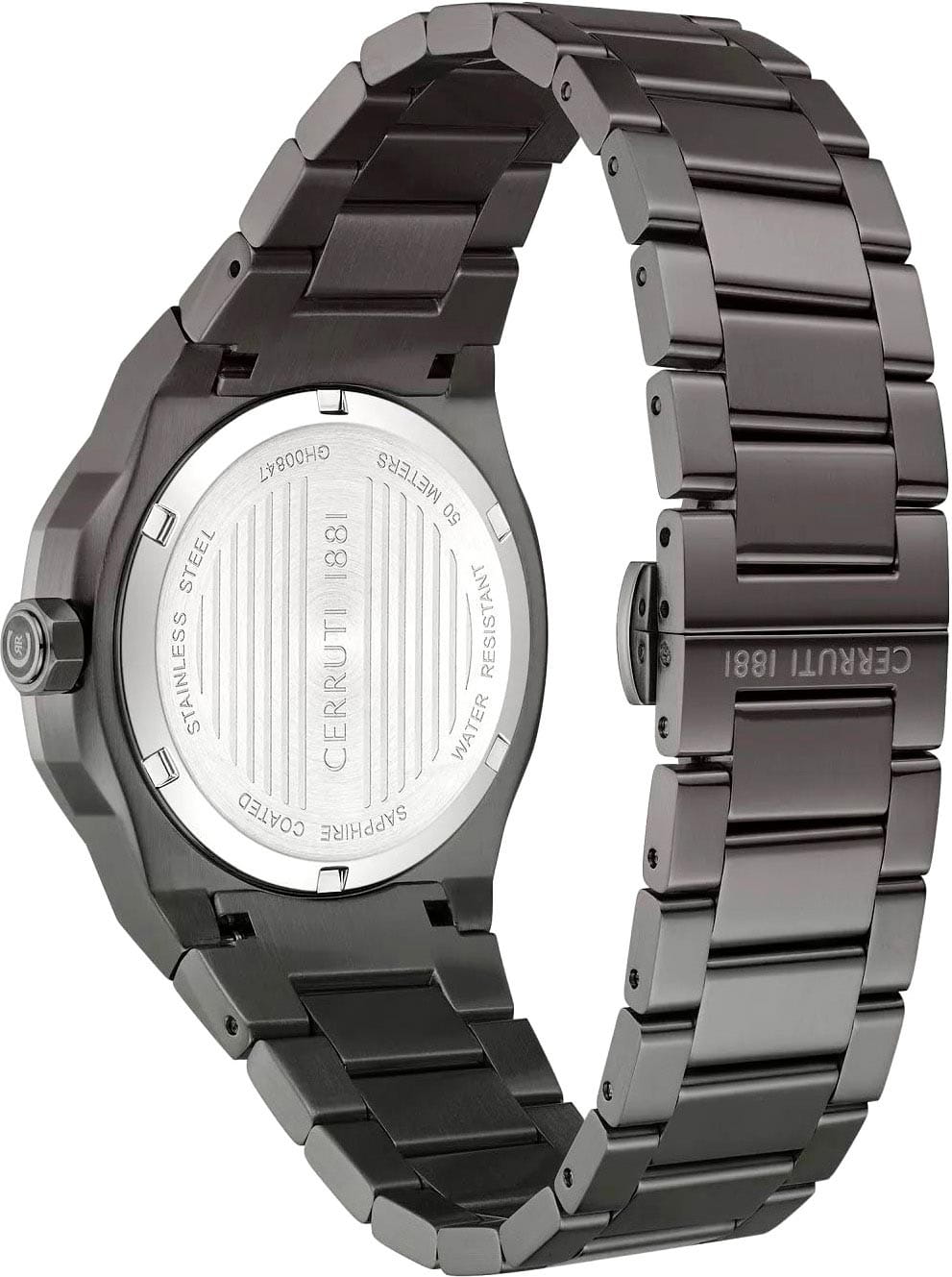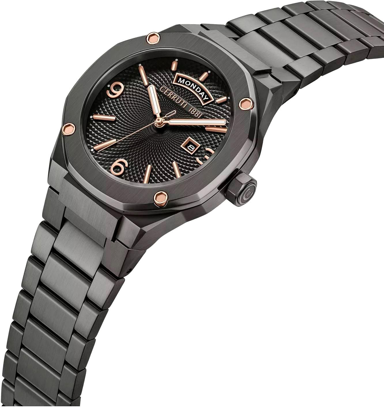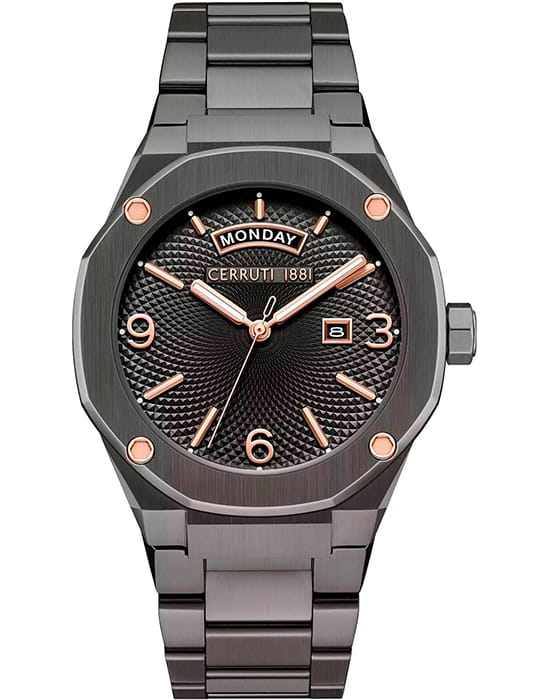 Cerruti 1881 CIWGH0084703 — утончённые мужские часы, в которых классика и современная геометрия нашли безупречный баланс. Стальной корпус с PVD-покрытиемPVDУльтратонкое покрытие наносится в технике вакуумного напыления, сочетает в себе нитрид титана особой прочности со слоем золота или оксида хрома. Несёт в себе декоративную или защитную функцию. и восьмигранным безелемБезельВнешний ободок, закрепляющий стекло. В спортивных часах так называется поворотное кольцо с делениями на циферблате, выполняет роль таймера – замеряет отрезки времени на шкале. Неподвижный безель – элемент декора. Однонаправленно вращающийся безель на дайверских часах позволяет фиксировать моменты погружения и выныривания на поверхность. подчёркивает архитектурную точность форм, а глубокий циферблат с гильошированным узором придаёт модели выразительную глубину. Индикаторы дня недели и даты оформлены в элегантных окнах на «12» и «3 часах», обеспечивая визуальную симметрию и удобство считывания. Прочные стрелки покрыты люминесцентным покрытиемЛюминесцентное покрытиеПозволяет считывать показания времени в темноте. Производители наносят на стрелки, часовые индексы, безель или поверхность циферблата светонакопительный состав, дающий холодное свечение., что гарантирует отличную читаемость даже в темноте. Циферблат защищён надёжным минеральным стекломМинеральное стеклоМинеральное стекло представляет собой искусственно выращенный минерал кварца. Такое стекло отличается особой устойчивостью к повреждениям и царапинам. Уступает по некоторым качествам сапфировому стеклу., устойчивым к царапинам, а стальной браслет с PVD-покрытиемPVDУльтратонкое покрытие наносится в технике вакуумного напыления, сочетает в себе нитрид титана особой прочности со слоем золота или оксида хрома. Несёт в себе декоративную или защитную функцию. фиксируется удобной застёжкой «бабочка»Застёжка "бабочка"Такой вид застёжки дополняется предохранителями, помогающими избежать случайного раскрытия браслета. Обладают изящным исполнением. , обеспечивающей комфорт и безопасность при носке. Строгая форма и продуманные детали делают эту модель идеальным выбором для мужчины, ценящего сдержанную роскошь и точность швейцарского стиля.