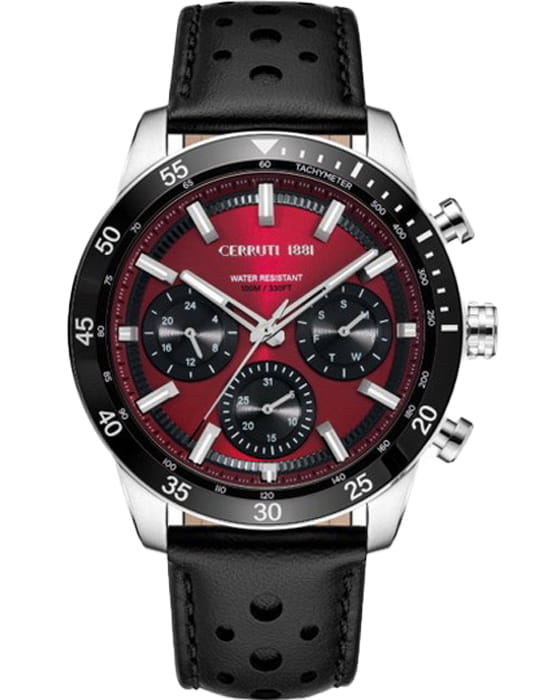 Французские мужские часы Cerruti 1881 Turchino XCIWGF0007602-WWL, кварцевый механизм с высокой точностью. Минеральное стеклоМинеральное стеклоМинеральное стекло представляет собой искусственно выращенный минерал кварца. Такое стекло отличается особой устойчивостью к повреждениям и царапинам. Уступает по некоторым качествам сапфировому стеклу. устойчивое к мелким механическим повреждениям. Корпус часов изготовлен из нержавеющей стали. БезельБезельВнешний ободок, закрепляющий стекло. В спортивных часах так называется поворотное кольцо с делениями на циферблате, выполняет роль таймера – замеряет отрезки времени на шкале. Неподвижный безель – элемент декора. Однонаправленно вращающийся безель на дайверских часах позволяет фиксировать моменты погружения и выныривания на поверхность. из нержавеющей стали и керамики со шкалой тахиметрТахиметрРазмеченная шкала, располагается на ободке или безеле часов. Тахиметр позволяет рассчитать скорость на определённом участке пути, расстояние измеряется в километрах или милях.. Циферблат выполнен с метками в виде штрихов. Стрелки и метки с люминесцентным покрытиемЛюминесцентное покрытиеПозволяет считывать показания времени в темноте. Производители наносят на стрелки, часовые индексы, безель или поверхность циферблата светонакопительный состав, дающий холодное свечение.. Класс водозащиты: 100 метров, позволит плавать, нырять и заниматься другими водными видами спорта. Кожаный ремешок на стандартной застежке.