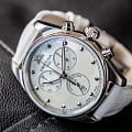 Сочетание перламутрового циферблата и трёх мини-циферблатов, хронографа смотрится невероятно изысканно и технологично. Белый кожаный ремешок нежный на ощупь, застежка-бабочка удобная. Выглядят очень дорого и современно, при этом размер 34 мм идеален для женской руки, не громоздко, но функционал весь на виду.