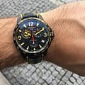 Наручные часы в спортивном стиле дополнены красными и жёлтыми деталями, что символизирует скоростное напряжение на гоночной трассе. Отличным дополнением стал кожаный ремешок. Кварцевый швейцарский механизм ETA G10.212 Precidrive™Precidrive™Инновационный кварцевый механизм Certina. Часы, оснащённые этим швейцарским калибром, приравниваются к точности к сертифицированным хронометрам, точность хода составляет +/-10 секунд в год. с повышенной точностью хода, подтверждённой сертификатом COSCСертификат COSCОфициальный сертификат, подтверждающий то, что часы ходят с особо высокой точностью. Для получения документа часы подвергаются тестовым испытаниям, разработанным швейцарским институтом тестирования хронометров COSC. Допустимая норма для механических часов -4/+6 секунд в день, для кварцевых моделей +/- 0,07 секунд в день.. Система DS ConceptDS ConceptDouble Security Concept, обозначает двойную надёжность и безупречную точность часов Certina. Двойная система защиты подразумевает обеспечение максимальной устойчивости к ударам и высоких показателей водонепроницаемости.. Двухстороннее антибликовое покрытие для стекла из сапфира. Корпус из нержавеющей стали с PVD-покрытиемPVDУльтратонкое покрытие наносится в технике вакуумного напыления, сочетает в себе нитрид титана особой прочности со слоем золота или оксида хрома. Несёт в себе декоративную или защитную функцию.. Стрелки и индексы с составом SuperLumiNovaЛюминесцентное покрытиеПозволяет считывать показания времени в темноте. Производители наносят на стрелки, часовые индексы, безель или поверхность циферблата светонакопительный состав, дающий холодное свечение.. Заводная головка с защитой. ХронографХронографФункция позволяет измерять отрезки времени с особой точностью: часы, минуты, секунды. Верным признаком хронографа является наличие на циферблате 3 дополнительных окошек-счётчиков., шкала тахиметраТахиметрРазмеченная шкала, располагается на ободке или безеле часов. Тахиметр позволяет рассчитать скорость на определённом участке пути, расстояние измеряется в километрах или милях., календарь, секундомер, индикатор EOLEOLПредставляет собой систему, уведомляющую владельца часов о необходимости замены элемента питания. За 2 недели до полного разряда батарейки секундная стрелка перестаёт ходить чётко и начинает перепрыгивать на 3-4 деления., Lap-функция измерения промежуточного времени (круга). Диаметр корпуса: 41 мм.