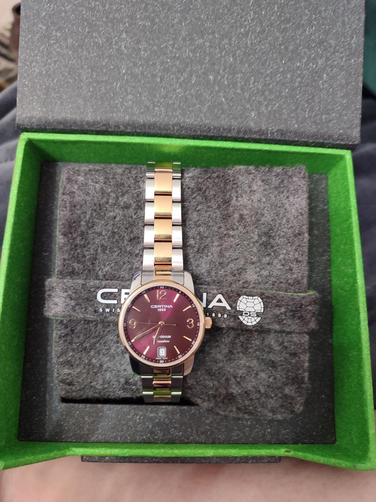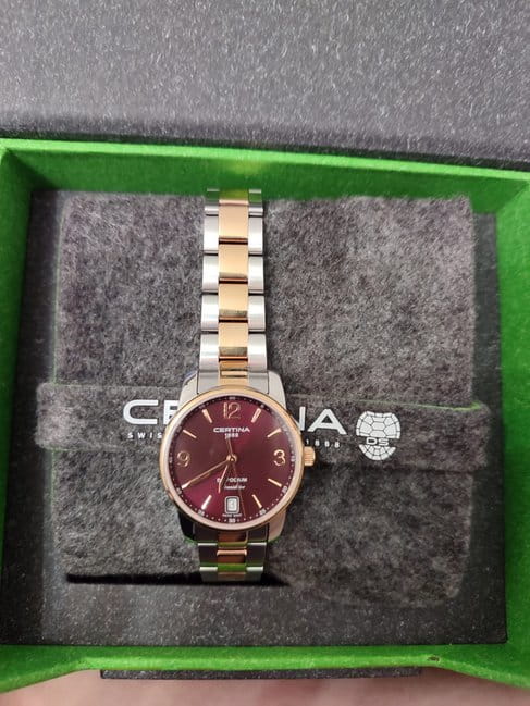 Модель с изысканной формой корпуса умело комбинирует элегантность и спортивный стиль, претворяя в жизнь универсальные часы для делового, повседневного или вечернего наряда. Они оснащены кварцевым швейцарским калибром ETA F03.411 Precidrive™Precidrive™Инновационный кварцевый механизм Certina. Часы, оснащённые этим швейцарским калибром, приравниваются к точности к сертифицированным хронометрам, точность хода составляет +/-10 секунд в год., обеспечивающим абсолютную точность показателей. Сапфировое стекло с односторонним антибликовым покрытием защищает яркий циферблат. Водостойкость 100 метров. Концепция DS ConceptDS ConceptDouble Security Concept, обозначает двойную надёжность и безупречную точность часов Certina. Двойная система защиты подразумевает обеспечение максимальной устойчивости к ударам и высоких показателей водонепроницаемости.. Нержавеющая сталь с частичным PVD-покрытиемPVDУльтратонкое покрытие наносится в технике вакуумного напыления, сочетает в себе нитрид титана особой прочности со слоем золота или оксида хрома. Несёт в себе декоративную или защитную функцию. цвета розового золота. . Апертура даты, функция EOLEOLПредставляет собой систему, уведомляющую владельца часов о необходимости замены элемента питания. За 2 недели до полного разряда батарейки секундная стрелка перестаёт ходить чётко и начинает перепрыгивать на 3-4 деления.. Диаметр корпуса: 33 мм.