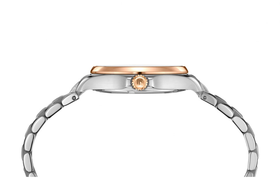 Аксессуар обладает изящным силуэтом, отражающим классический стиль и элегантность. Циферблат украшен 3 роскошными бриллиантами оттенка Top Wesselton. Часы комплектуются высокоточным кварцевым калибром F06.411 от швейцарской компании ETA, высокая точность механизма подтверждается сертификатом хронометра COSCСертификат COSCОфициальный сертификат, подтверждающий то, что часы ходят с особо высокой точностью. Для получения документа часы подвергаются тестовым испытаниям, разработанным швейцарским институтом тестирования хронометров COSC. Допустимая норма для механических часов -4/+6 секунд в день, для кварцевых моделей +/- 0,07 секунд в день.. Концепция DS ConceptDS ConceptDouble Security Concept, обозначает двойную надёжность и безупречную точность часов Certina. Двойная система защиты подразумевает обеспечение максимальной устойчивости к ударам и высоких показателей водонепроницаемости. гарантирует повышенную ударопрочность часов и сохранение водонепроницаемости до 20 бар. Одностороннее антибликовое покрытие сапфирового стекла.Корпус и браслет из хирургической стали 316L. PVD-покрытиеPVDУльтратонкое покрытие наносится в технике вакуумного напыления, сочетает в себе нитрид титана особой прочности со слоем золота или оксида хрома. Несёт в себе декоративную или защитную функцию. цвета розового золота. . Окошко даты, функция EOLEOLПредставляет собой систему, уведомляющую владельца часов о необходимости замены элемента питания. За 2 недели до полного разряда батарейки секундная стрелка перестаёт ходить чётко и начинает перепрыгивать на 3-4 деления.. Диаметр корпуса: 33,8 мм.