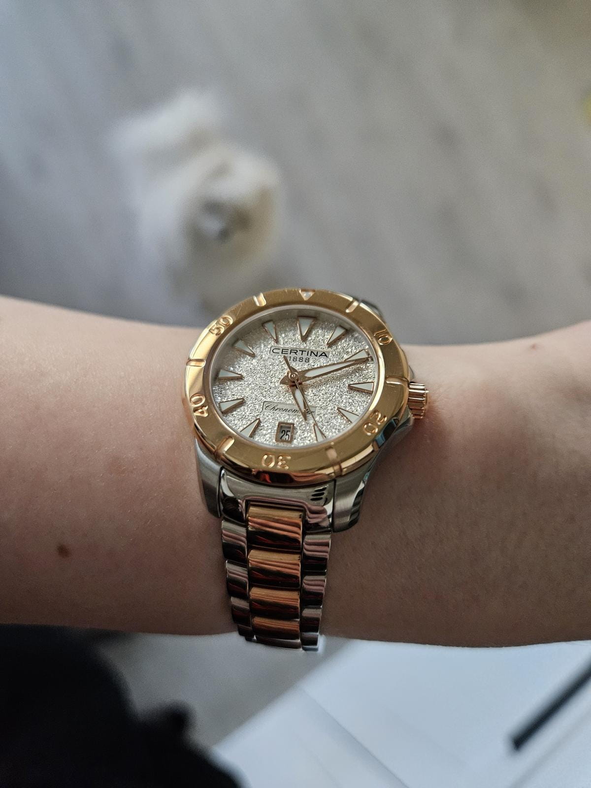 Женские швейцарские часы Certina DS Action Lady C032.951.22.031.00 из коллекции DS Action символизируют любовь бренда к водной стихии и высокоточным механизмам. Компактный аксессуар создан по всем правилам дайверской тематики: вращающийся безель, крупная индикация времени, завинчивающаяся заводная головка и задняя крышка. Стильно смотрится серебристый циферблат в сочетании с холодным блеском нержавеющей стали 316L с PVD-покрытиемPVDУльтратонкое покрытие наносится в технике вакуумного напыления, сочетает в себе нитрид титана особой прочности со слоем золота или оксида хрома. Несёт в себе декоративную или защитную функцию..Часы оснащены швейцарским кварцевым калибром ETA F04.411 Precidrive™Precidrive™Инновационный кварцевый механизм Certina. Часы, оснащённые этим швейцарским калибром, приравниваются к точности к сертифицированным хронометрам, точность хода составляет +/-10 секунд в год., точность хода которого отмечена официальным сертификатом COSCСертификат COSCОфициальный сертификат, подтверждающий то, что часы ходят с особо высокой точностью. Для получения документа часы подвергаются тестовым испытаниям, разработанным швейцарским институтом тестирования хронометров COSC. Допустимая норма для механических часов -4/+6 секунд в день, для кварцевых моделей +/- 0,07 секунд в день.. Модель отличается максимальной водонепроницаемостью 300 метров, сапфировое стекло дополнено антибликовым покрытием. Функции: отображение даты, индикатор EOLEOLПредставляет собой систему, уведомляющую владельца часов о необходимости замены элемента питания. За 2 недели до полного разряда батарейки секундная стрелка перестаёт ходить чётко и начинает перепрыгивать на 3-4 деления.. Диаметр корпуса: 29 мм. Производство и сборка: Швейцария.