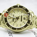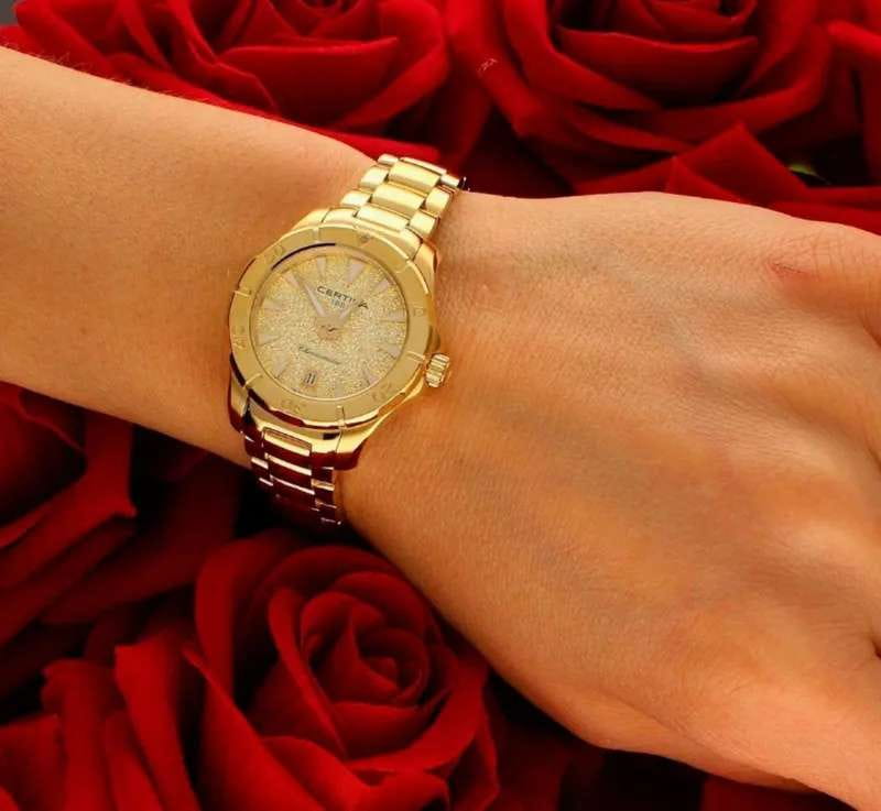 Certina DS Action Lady C032.951.33.361.00 из коллекции DS Action символизируют любовь бренда к водной стихии и высокоточным механизмам. Компактный аксессуар создан по всем правилам дайверской тематики: вращающийся безельБезельВнешний ободок, закрепляющий стекло. В спортивных часах так называется поворотное кольцо с делениями на циферблате, выполняет роль таймера – замеряет отрезки времени на шкале. Неподвижный безель – элемент декора. Однонаправленно вращающийся безель на дайверских часах позволяет фиксировать моменты погружения и выныривания на поверхность., крупная индикация времени, завинчивающаяся заводная головка и задняя крышка. Стильно смотрится золотистый циферблат в сочетании с холодным блеском нержавеющей стали 316L с PVD-покрытиемPVDУльтратонкое покрытие наносится в технике вакуумного напыления, сочетает в себе нитрид титана особой прочности со слоем золота или оксида хрома. Несёт в себе декоративную или защитную функцию.. Часы оснащены швейцарским кварцевым калибром ETA F04.412 Precidrive™Precidrive™Инновационный кварцевый механизм Certina. Часы, оснащённые этим швейцарским калибром, приравниваются к точности к сертифицированным хронометрам, точность хода составляет +/-10 секунд в год., точность хода которого отмечена официальным сертификатом COSCСертификат COSCОфициальный сертификат, подтверждающий то, что часы ходят с особо высокой точностью. Для получения документа часы подвергаются тестовым испытаниям, разработанным швейцарским институтом тестирования хронометров COSC. Допустимая норма для механических часов -4/+6 секунд в день, для кварцевых моделей +/- 0,07 секунд в день.. Модель отличается максимальной водонепроницаемостью 200 метров, сапфировое стекло дополнено антибликовым покрытием. Функции: отображение даты, индикатор EOLEOLПредставляет собой систему, уведомляющую владельца часов о необходимости замены элемента питания. За 2 недели до полного разряда батарейки секундная стрелка перестаёт ходить чётко и начинает перепрыгивать на 3-4 деления.. Диаметр корпуса: 29 мм. Производство и сборка: Швейцария.
