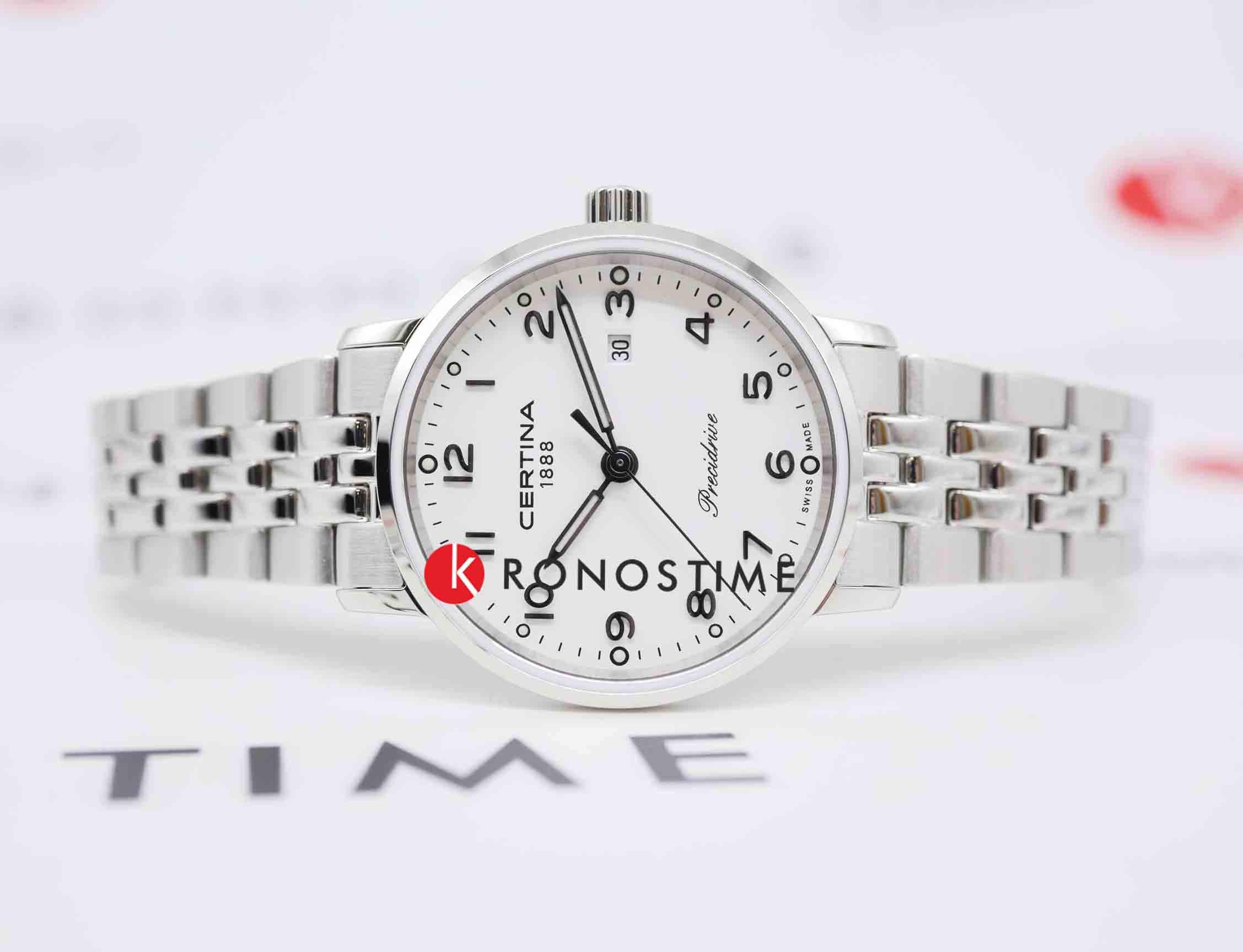 Модель отражает элегантность и изысканность. Швейцарский кварцевый механизм ETA F03.411 Precidrive™Precidrive™Инновационный кварцевый механизм Certina. Часы, оснащённые этим швейцарским калибром, приравниваются к точности к сертифицированным хронометрам, точность хода составляет +/-10 секунд в год.. Корпус и браслет из нержавеющей стали 316L. Система DS ConceptDS ConceptDouble Security Concept, обозначает двойную надёжность и безупречную точность часов Certina. Двойная система защиты подразумевает обеспечение максимальной устойчивости к ударам и высоких показателей водонепроницаемости.. Сапфировое стекло с антибликовым покрытием. Индикация числа, функция EOLEOLПредставляет собой систему, уведомляющую владельца часов о необходимости замены элемента питания. За 2 недели до полного разряда батарейки секундная стрелка перестаёт ходить чётко и начинает перепрыгивать на 3-4 деления..