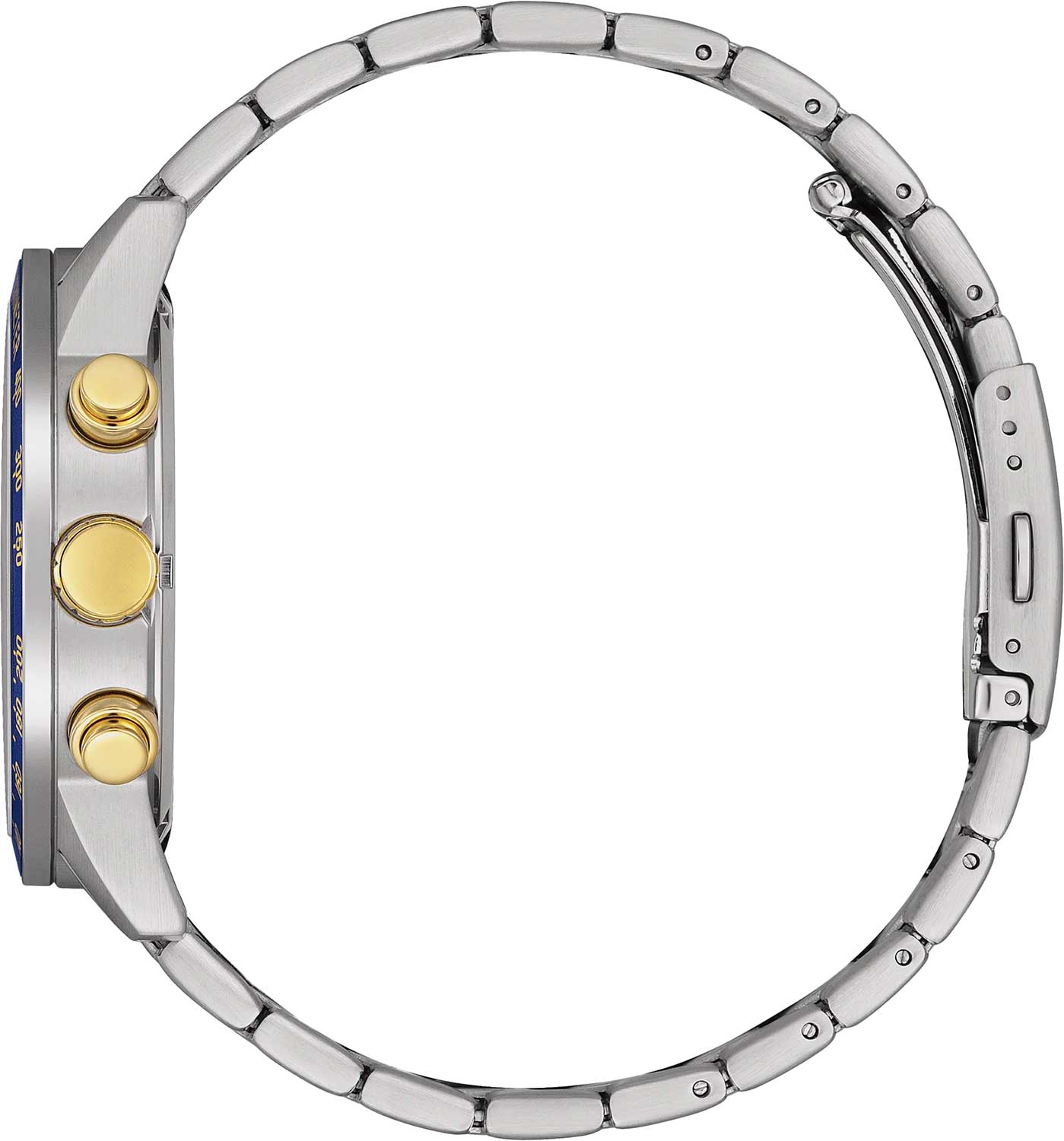 Citizen Chronograph AN3684-59L часы-хронографХронографФункция позволяет измерять отрезки времени с особой точностью: часы, минуты, секунды. Верным признаком хронографа является наличие на циферблате 3 дополнительных окошек-счётчиков. с секундомеромСекундомерСекундоме́р — прибор, способный измерять интервалы времени с точностью до долей секунды. спортивного дизайна с высоким уровнем водозащиты. Корпус из нержавеющей стали диаметром 44 мм идеально сбалансирован. Минеральное стеклоМинеральное стеклоМинеральное стекло представляет собой искусственно выращенный минерал кварца. Такое стекло отличается особой устойчивостью к повреждениям и царапинам. Уступает по некоторым качествам сапфировому стеклу. обеспечивает отличную защиту циферблата от царапин. Часы работают на основе кварцевого механизма. Стальной браслет на раскладной застёжкеРаскладная застёжкаТакой тип застёжки используется только на браслетах из металла. Она никогда не раскрывается полностью, происходит разделение на 2 и более частей. Раскладывающая застёжка снизит вероятность потери часов к минимуму. с частичным IP-покрытиемIP-покрытиеМетод ионного напыления. Демонстрирует повышенную устойчивость к истиранию, окислению и химическим веществам. Под воздействием высокого давления и температуры около 1500°C молекулы металла надёжно соединяются с частицами корпуса часов. идеально дополняют дизайн часов, обеспечивая комфортное ношение. Стрелки и метки на циферблате имеют люминесцентное покрытиеЛюминесцентное покрытиеПозволяет считывать показания времени в темноте. Производители наносят на стрелки, часовые индексы, безель или поверхность циферблата светонакопительный состав, дающий холодное свечение. позволяющее легко определять время даже в темноте. БезельБезельВнешний ободок, закрепляющий стекло. В спортивных часах так называется поворотное кольцо с делениями на циферблате, выполняет роль таймера – замеряет отрезки времени на шкале. Неподвижный безель – элемент декора. Однонаправленно вращающийся безель на дайверских часах позволяет фиксировать моменты погружения и выныривания на поверхность. с IP-покрытиемIP-покрытиеМетод ионного напыления. Демонстрирует повышенную устойчивость к истиранию, окислению и химическим веществам. Под воздействием высокого давления и температуры около 1500°C молекулы металла надёжно соединяются с частицами корпуса часов. и шкалой тахиметраТахиметрРазмеченная шкала, располагается на ободке или безеле часов. Тахиметр позволяет рассчитать скорость на определённом участке пути, расстояние измеряется в километрах или милях.. Секундомер с точностью 1с и временем измерения 12ч отображается центральной стрелкой. Окошко даты находится в положении 3 часа. Циферблат с метками в виде штрихов выполнен по технологии Sunray (солнечные лучи). Часы обладают впечатляющей водонепроницаемостью до 100WR, что делает их идеальными для повседневной носки.