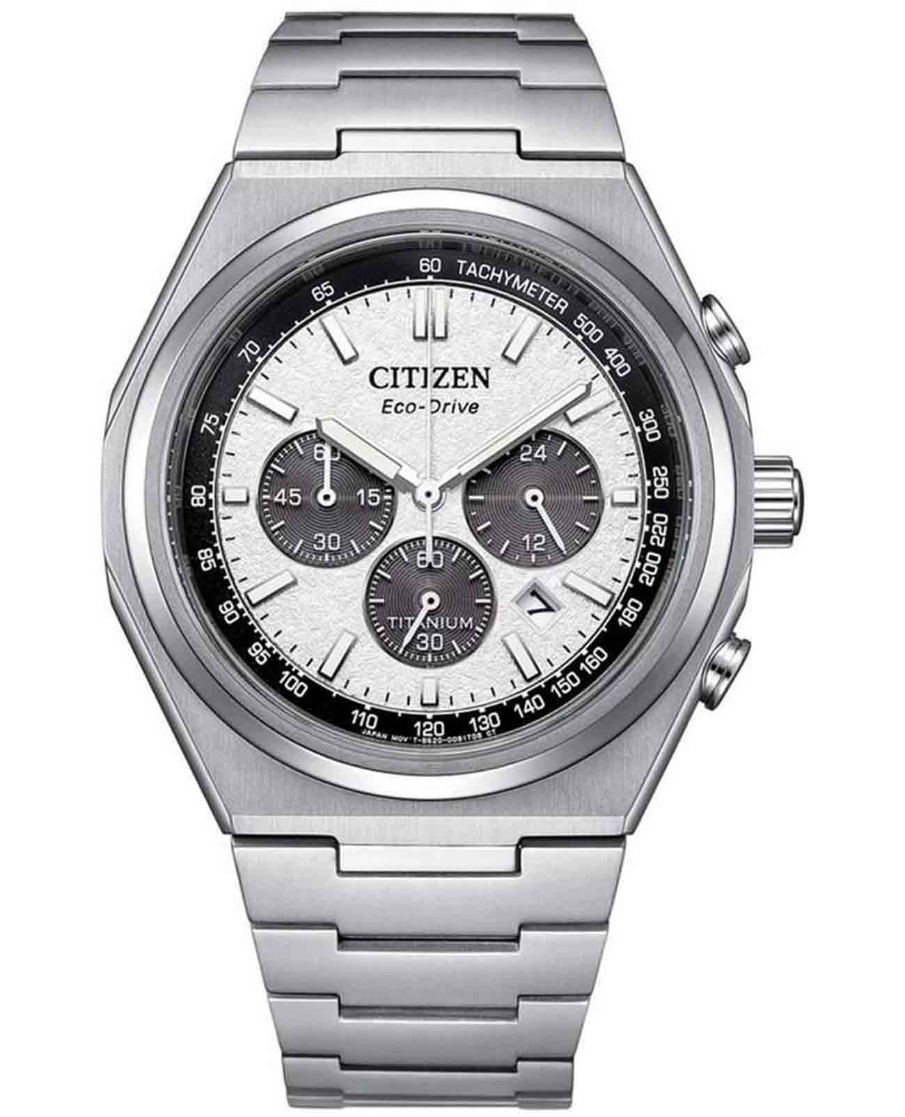 Citizen CA4610-85A — это стильные мужские кварцевые часы с функцией хронографаХронографФункция позволяет измерять отрезки времени с особой точностью: часы, минуты, секунды. Верным признаком хронографа является наличие на циферблате 3 дополнительных окошек-счётчиков., сочетающие передовые технологии и современный дизайн. Корпус и браслет выполнены из сверхлегкого и прочного титана, что обеспечивает комфортное ношение и высокую износостойкость. Серебристый круглый циферблат защищён устойчивым к царапинам сапфировым стекломСапфировое стеклоПрочный и надёжный материал из кристалла сапфира синтетического происхождения, характеризующийся особой твёрдостью и устойчивостью к царапинам и повреждениям.. Часы работают на инновационной системе Eco-Drive, питание которой осуществляется от солнечной энергии, что позволяет отказаться от замены батарейки, а запас хода достигает 9 месяцев. Стрелки с люминесцентным покрытиемЛюминесцентное покрытиеПозволяет считывать показания времени в темноте. Производители наносят на стрелки, часовые индексы, безель или поверхность циферблата светонакопительный состав, дающий холодное свечение. обеспечивают отличную читаемость времени даже в темное время суток. Для удобства предусмотрены функция предотвращения перезарядки и индикация уровня заряда EOLEOLПредставляет собой систему, уведомляющую владельца часов о необходимости замены элемента питания. За 2 недели до полного разряда батарейки секундная стрелка перестаёт ходить чётко и начинает перепрыгивать на 3-4 деления.. Надёжный японский механизм Citizen B620 обеспечивает точный ход, а центральные часовая и минутная стрелки, вынесенная на отдельный малый циферблат секундная стрелка и апертура даты между 4 и 5 часами делают использование максимально удобным. Модель поддерживает 12- и 24-часовой формат времени, а также оснащена секундомером для точного измерения промежутков. Диаметр корпуса составляет 42,5 мм, толщина — 11,6 мм, вес — около 101 грамма. Водозащита уровня WR 100 позволяет не снимать часы во время плавания без глубокого погружения. Раскладная застёжкаРаскладная застёжкаТакой тип застёжки используется только на браслетах из металла. Она никогда не раскрывается полностью, происходит разделение на 2 и более частей. Раскладывающая застёжка снизит вероятность потери часов к минимуму. на браслете обеспечивает надежную фиксацию на запястье. Модель оснащена хронографомХронографФункция позволяет измерять отрезки времени с особой точностью: часы, минуты, секунды. Верным признаком хронографа является наличие на циферблате 3 дополнительных окошек-счётчиков. с секундомеромСекундомерСекундоме́р — прибор, способный измерять интервалы времени с точностью до долей секунды. и тахиметромТахиметрРазмеченная шкала, располагается на ободке или безеле часов. Тахиметр позволяет рассчитать скорость на определённом участке пути, расстояние измеряется в километрах или милях..