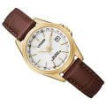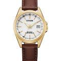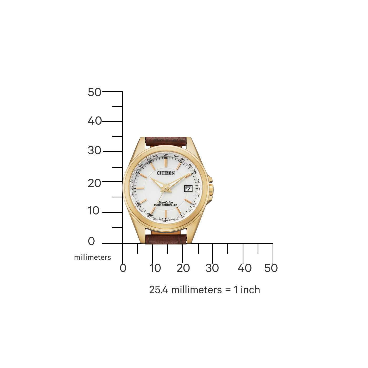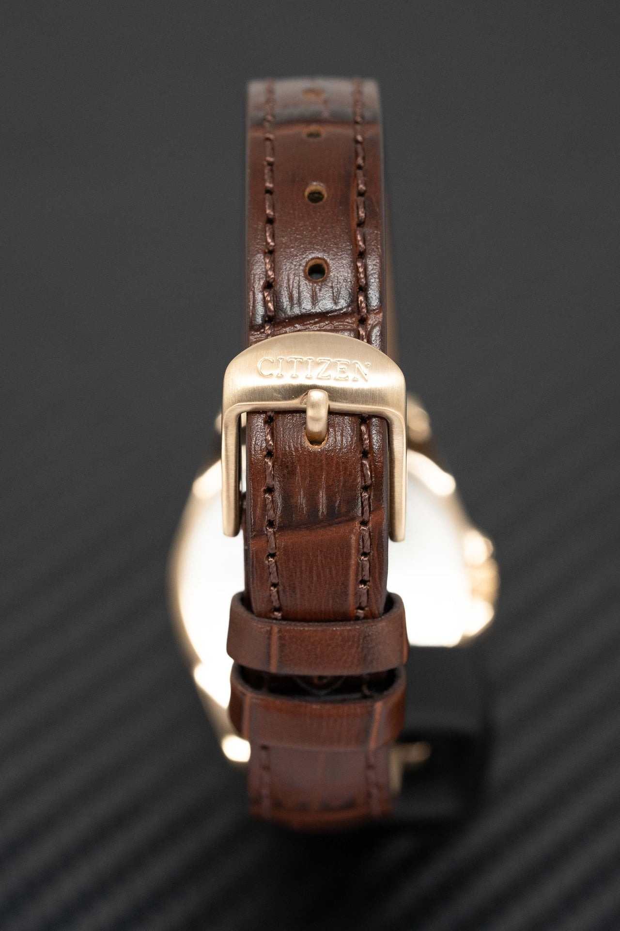 Citizen EC1183-16A — стильные и функциональные часы для современных леди, созданные в Японии. Модель оснащена точным кварцевым механизмом с калибром Citizen H246 и инновационной системой Eco-Drive, которая обеспечивает питание от солнечной энергии и избавляет от необходимости замены батарейки, а запас хода составляет до 180 дней. Для дополнительного удобства предусмотрены функции индикации заряда EOLEOLПредставляет собой систему, уведомляющую владельца часов о необходимости замены элемента питания. За 2 недели до полного разряда батарейки секундная стрелка перестаёт ходить чётко и начинает перепрыгивать на 3-4 деления., сохранения энергии и предотвращения перезарядки, а при включенной функции сохранения энергии часы способны работать до трёх лет. Корпус выполнен из высококачественной нержавеющей стали с золотистым IP-покрытиемIP-покрытиеМетод ионного напыления. Демонстрирует повышенную устойчивость к истиранию, окислению и химическим веществам. Под воздействием высокого давления и температуры около 1500°C молекулы металла надёжно соединяются с частицами корпуса часов., а белый циферблат украшен метками в виде штрихов и защищён сапфировым стекломСапфировое стеклоПрочный и надёжный материал из кристалла сапфира синтетического происхождения, характеризующийся особой твёрдостью и устойчивостью к царапинам и повреждениям. с высокой устойчивостью к царапинам. Стрелки с люминесцентным покрытиемЛюминесцентное покрытиеПозволяет считывать показания времени в темноте. Производители наносят на стрелки, часовые индексы, безель или поверхность циферблата светонакопительный состав, дающий холодное свечение. обеспечивают отличную читаемость времени даже в темное время суток. Окошко даты удобно расположено на отметке 3 часа, а вечный календарьВечный календарьКлассическое часовое усложнение, представляющее собой календарь, рассчитанный на несколько лет вперёд (стандартно – до 2099 года). Определяет текущую дату, день недели, месяц. всегда показывает актуальное число. Часы автоматически принимают сигналы от радиовышек по всему миру и корректируют время с высокой точностью — поддерживается синхронизация в Европе, США, Японии и Китае, а также мировое время для 24 городов и автоматический переход на зимнее и летнее время. Диаметр корпуса составляет 29,3 мм, толщина — 8,4 мм, вес — всего 67 грамм, что делает модель особенно комфортной для повседневного ношения. Заводная головка снабжена защитой, а коричневый кожаный ремешок оборудован удобной классической застежкой. Надёжная водозащита 100WR позволяет использовать часы даже при плавании.