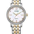 Часы Citizen EL3106-59D представляют собой элегантную модель, выполненную в Японии, сочетающую в себе современные технологии и утончённый дизайн. Корпус изготовлен из прочной нержавеющей стали, что обеспечивает долговечность и привлекательный внешний вид. Диаметр корпуса составляет 31 мм, а толщина — всего 7 мм, что делает часы изящными и аккуратными на запястье. Особое внимание привлекает безельБезельВнешний ободок, закрепляющий стекло. В спортивных часах так называется поворотное кольцо с делениями на циферблате, выполняет роль таймера – замеряет отрезки времени на шкале. Неподвижный безель – элемент декора. Однонаправленно вращающийся безель на дайверских часах позволяет фиксировать моменты погружения и выныривания на поверхность., украшенный мерцающими кристаллами, которые придают часам особый шарм и изысканность. Надёжный кварцевый механизм гарантирует точность хода, а водозащита уровня WR 50 позволяет не снимать часы при мытье рук или во время дождя. Перламутровый циферблат украшен часовыми индексами в виде точек и цифр, а также оснащён центральными стрелками часов, минут и секунд для удобного считывания времени и кристаллами. Минеральное стеклоМинеральное стеклоМинеральное стекло представляет собой искусственно выращенный минерал кварца. Такое стекло отличается особой устойчивостью к повреждениям и царапинам. Уступает по некоторым качествам сапфировому стеклу. устойчиво к появлению мелких царапин, сохраняя прозрачность и презентабельный вид. Стальной браслет с частичным золотистым IP-покрытиемIP-покрытиеМетод ионного напыления. Демонстрирует повышенную устойчивость к истиранию, окислению и химическим веществам. Под воздействием высокого давления и температуры около 1500°C молекулы металла надёжно соединяются с частицами корпуса часов. и раскладной застёжкойРаскладная застёжкаТакой тип застёжки используется только на браслетах из металла. Она никогда не раскрывается полностью, происходит разделение на 2 и более частей. Раскладывающая застёжка снизит вероятность потери часов к минимуму. надежно фиксирует часы на запястье, обеспечивая комфорт при ежедневном ношении.