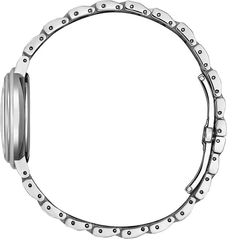 Часы Citizen EM0910-80N — воплощение изысканности и современных технологий, выполненное в Японии. Корпус и литой браслет изготовлены из прочной нержавеющей стали, что гарантирует долговечность и элегантный внешний вид. Перламутровый синий циферблат с завораживающими переливами украшен бриллиантом, а часовые метки выполнены в виде точек, что придаёт образу особую утонченность. Заводная головка с защитой находится в положении 8 часов и также украшена камнем. Защиту от царапин обеспечивает сапфировое стеклоСапфировое стеклоПрочный и надёжный материал из кристалла сапфира синтетического происхождения, характеризующийся особой твёрдостью и устойчивостью к царапинам и повреждениям., сохраняющее безупречный вид часов на длительное время. Модель оснащена инновационной системой Eco-Drive, работающей на солнечной энергии и не требующей замены батарейки, с запасом хода до 180 дней. Предусмотрена функция индикации уровня заряда (EOLEOLПредставляет собой систему, уведомляющую владельца часов о необходимости замены элемента питания. За 2 недели до полного разряда батарейки секундная стрелка перестаёт ходить чётко и начинает перепрыгивать на 3-4 деления.) и предотвращения перезарядки. Диаметр корпуса составляет 30 мм, толщина — 8,5 мм, вес — 74 г, что обеспечивает комфортное ношение в течение всего дня. Водозащита уровня 50WR позволяет не снимать часы при мытье рук или в дождливую погоду. Браслет с застежкой «бабочка»Застёжка "бабочка"Такой вид застёжки дополняется предохранителями, помогающими избежать случайного раскрытия браслета. Обладают изящным исполнением. обеспечивает дополнительный комфорт и безопасность при носке. Эта модель станет не только стильным аксессуаром, но и символом безупречного вкуса и внимания к деталям.