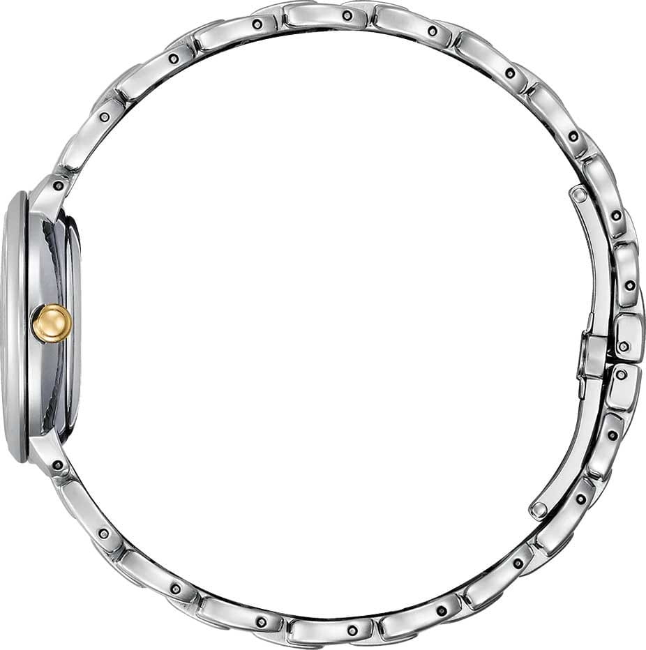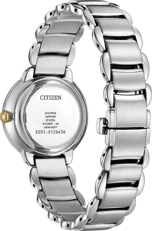 Часы Citizen EM0927-87Y произведены в Японии и оснащены точным кварцевым механизмом калибра Citizen E031 с инновационной системой Eco-Drive, работающей от солнечной энергии и обеспечивающей до 180 дней автономной работы без замены батареек. Корпус и браслет изготовлены из прочной нержавеющей стали, что придает изделию элегантный и современный вид, а браслет оснащен удобной застежкой «бабочка»Застёжка "бабочка"Такой вид застёжки дополняется предохранителями, помогающими избежать случайного раскрытия браслета. Обладают изящным исполнением. . Перламутровый циферблат украшен изящными метками в виде точек и римских цифр, защищён надежным сапфировым стекломСапфировое стеклоПрочный и надёжный материал из кристалла сапфира синтетического происхождения, характеризующийся особой твёрдостью и устойчивостью к царапинам и повреждениям., устойчивым к царапинам. Водозащита 50WR позволяет не беспокоиться о контакте с водой в повседневной жизни. Компактные размеры корпуса (диаметр 28 мм, толщина 8 мм) и легкий вес (68 г) обеспечивают комфортное ношение в течение всего дня. Эта модель станет не только точным инструментом для измерения времени, но и стильным завершением вашего образа.