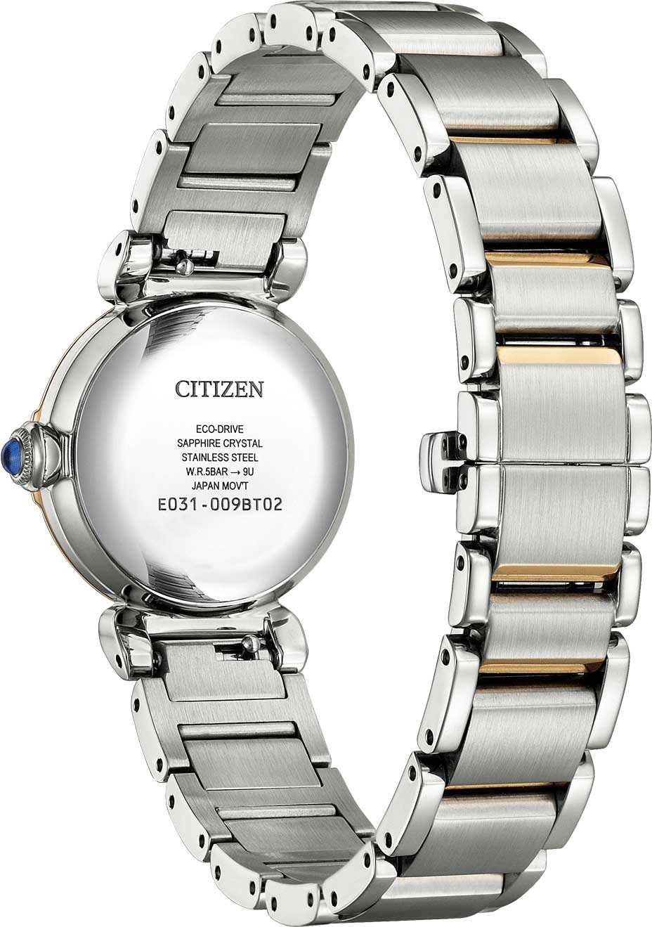 Элегантные японские часы Citizen EM1136-87D сочетают в себе современные технологии и изысканный дизайн. Кварцевый механизм Eco-Drive Caliber E031 обеспечивает высокую точность и не требует замены батареек, получая энергию от любого источника света. Корпус диаметром 26 мм и толщиной 8,1 мм выполнен из прочной нержавеющей стали, вес модели составляет 70 гр, а безельБезельВнешний ободок, закрепляющий стекло. В спортивных часах так называется поворотное кольцо с делениями на циферблате, выполняет роль таймера – замеряет отрезки времени на шкале. Неподвижный безель – элемент декора. Однонаправленно вращающийся безель на дайверских часах позволяет фиксировать моменты погружения и выныривания на поверхность. с золотистым IP-покрытиемIP-покрытиеМетод ионного напыления. Демонстрирует повышенную устойчивость к истиранию, окислению и химическим веществам. Под воздействием высокого давления и температуры около 1500°C молекулы металла надёжно соединяются с частицами корпуса часов., что придаёт аксессуару особый шарм. Сапфировое стеклоСапфировое стеклоПрочный и надёжный материал из кристалла сапфира синтетического происхождения, характеризующийся особой твёрдостью и устойчивостью к царапинам и повреждениям. отличается высокой устойчивостью к царапинам и мелким повреждениям. Перламутровый циферблат украшен арабскими цифрами и аккуратными метками в виде точек. Центральные часовая, минутная и секундная стрелки обеспечивают удобное считывание времени. Стальной браслет с частичным золотистым IP-покрытиемIP-покрытиеМетод ионного напыления. Демонстрирует повышенную устойчивость к истиранию, окислению и химическим веществам. Под воздействием высокого давления и температуры около 1500°C молекулы металла надёжно соединяются с частицами корпуса часов. оснащён надёжной застежкой «бабочка»Застёжка "бабочка"Такой вид застёжки дополняется предохранителями, помогающими избежать случайного раскрытия браслета. Обладают изящным исполнением. . Водонепроницаемость на уровне WR 50 позволяет не снимать часы во время мытья рук или прогулок под дождём.