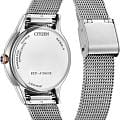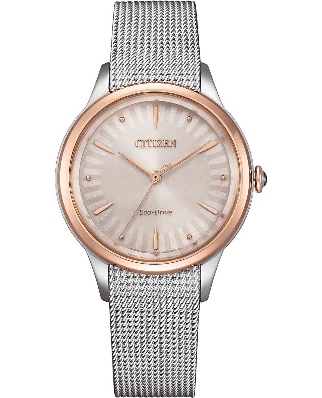 Часы Citizen EM1156-80X созданы для ценителей современного стиля и утончённой элегантности. Модель выполнена в Японии и оснащена кварцевым механизмом Citizen E031 с инновационной системой Eco-Drive, которая работает на солнечной энергии и не требует замены батарейки, обеспечивая до 180 дней автономной работы. Золотистый циферблат завораживает своими изысканными переливами, а изящные метки в виде штрихов и точек придают аксессуару лёгкость и гармонию. Сапфировое стеклоСапфировое стеклоПрочный и надёжный материал из кристалла сапфира синтетического происхождения, характеризующийся особой твёрдостью и устойчивостью к царапинам и повреждениям. надёжно защищает циферблат от царапин и повреждений. Корпус диаметром 32,5 мм и толщиной 7,6 мм изготовлен из нержавеющей стали, вес изделия составляет всего 45 граммов, что обеспечивает комфортное ношение в течение всего дня. БезельБезельВнешний ободок, закрепляющий стекло. В спортивных часах так называется поворотное кольцо с делениями на циферблате, выполняет роль таймера – замеряет отрезки времени на шкале. Неподвижный безель – элемент декора. Однонаправленно вращающийся безель на дайверских часах позволяет фиксировать моменты погружения и выныривания на поверхность. часов отличается золотистым IP-покрытиемIP-покрытиеМетод ионного напыления. Демонстрирует повышенную устойчивость к истиранию, окислению и химическим веществам. Под воздействием высокого давления и температуры около 1500°C молекулы металла надёжно соединяются с частицами корпуса часов., что придаёт аксессуару особый шарм. Заводная головка украшена камнем в форме кабошона, добавляя изысканный акцент. Стальной браслет миланского плетения c раскладным замкомРаскладной замокДанный вариант застежки используется только на часах с металлическим браслетом. Отличительная особенность такого крепления в том, что длина браслета становится универсальной и вы можете самостоятельно отрегулировать нужный вам размер – застежка просто двигается по браслету часов. удобно фиксируется на запястье и подчёркивает современный характер часов. Водозащита 50WR позволяет не беспокоиться о случайном попадании влаги. Эта модель станет стильным дополнением к вашему образу и подчеркнёт вашу индивидуальность.