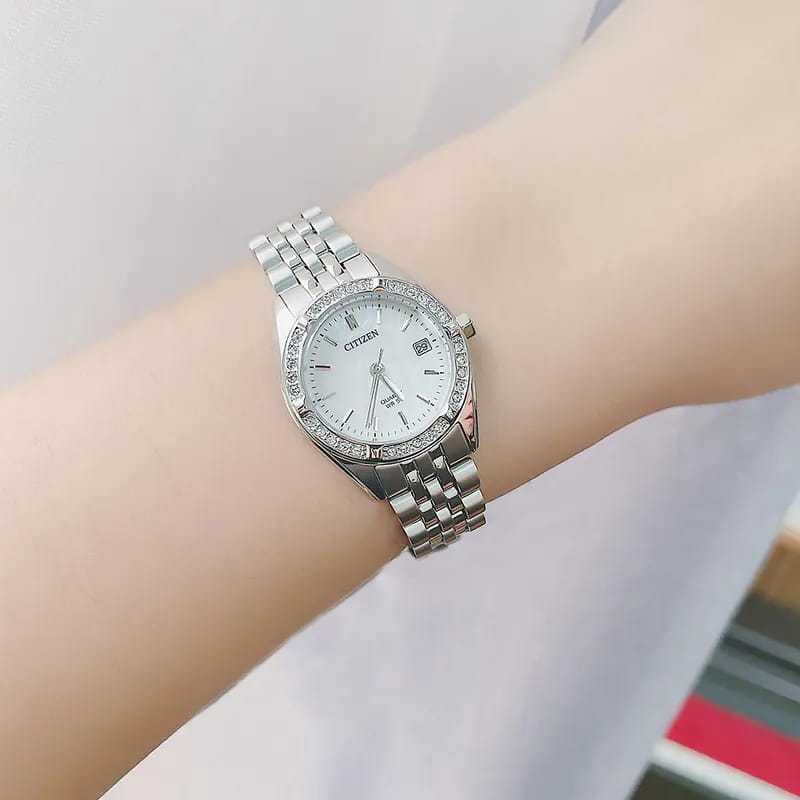 Часы Citizen EU6060-55D представляют собой элегантную модель, выполненную в Японии, сочетающую в себе современные технологии и утончённый дизайн. Корпус и браслет изготовлены из прочной нержавеющей стали, что обеспечивает долговечность и привлекательный внешний вид. Диаметр корпуса составляет 26 мм, что делает часы изящными и аккуратными на запястье. Особое внимание привлекает безельБезельВнешний ободок, закрепляющий стекло. В спортивных часах так называется поворотное кольцо с делениями на циферблате, выполняет роль таймера – замеряет отрезки времени на шкале. Неподвижный безель – элемент декора. Однонаправленно вращающийся безель на дайверских часах позволяет фиксировать моменты погружения и выныривания на поверхность., украшенный мерцающими кристаллами, которые придают часам особый шарм и изысканность. Стрелки с люминесцентным покрытиемЛюминесцентное покрытиеПозволяет считывать показания времени в темноте. Производители наносят на стрелки, часовые индексы, безель или поверхность циферблата светонакопительный состав, дающий холодное свечение.. Надёжный кварцевый механизм гарантирует точность хода, а водозащита уровня WR 50 позволяет не снимать часы при мытье рук или во время дождя. Циферблат украшен часовыми индексами в виде штрихов, а также оснащён окошком даты в позиции 3 часа, центральными стрелками часов, минут и секунд для удобного считывания времени и кристаллами. Минеральное стеклоМинеральное стеклоМинеральное стекло представляет собой искусственно выращенный минерал кварца. Такое стекло отличается особой устойчивостью к повреждениям и царапинам. Уступает по некоторым качествам сапфировому стеклу. устойчиво к появлению мелких царапин, сохраняя прозрачность и презентабельный вид. Стальной браслет с раскладной застёжкойРаскладная застёжкаТакой тип застёжки используется только на браслетах из металла. Она никогда не раскрывается полностью, происходит разделение на 2 и более частей. Раскладывающая застёжка снизит вероятность потери часов к минимуму. надежно фиксирует часы на запястье, обеспечивая комфорт при ежедневном ношении.