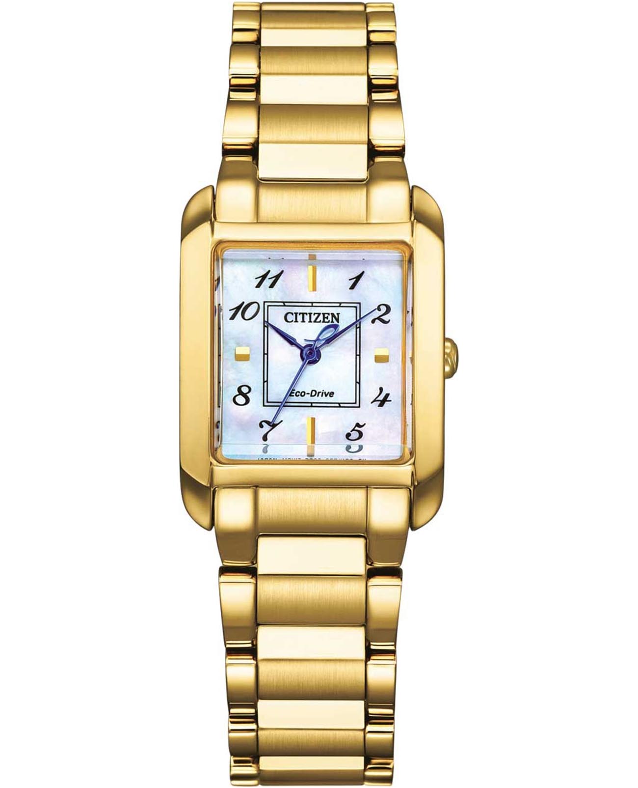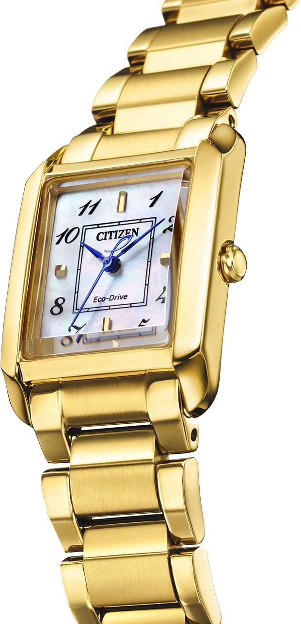 Элегантные часы Citizen EW5602-81D произведены в Японии и оснащены надежным кварцевым механизмом с калибром Citizen B035, работающим на инновационной системе Eco-Drive — часы заряжаются от солнечного света и не требуют замены батарейки, обеспечивая запас хода до 210 дней. Корпус выполнен из нержавеющей стали с изящным золотистым IP-покрытиемIP-покрытиеМетод ионного напыления. Демонстрирует повышенную устойчивость к истиранию, окислению и химическим веществам. Под воздействием высокого давления и температуры около 1500°C молекулы металла надёжно соединяются с частицами корпуса часов., а перламутровый циферблат защищает выпуклое сапфировое стеклоСапфировое стеклоПрочный и надёжный материал из кристалла сапфира синтетического происхождения, характеризующийся особой твёрдостью и устойчивостью к царапинам и повреждениям., устойчивое к царапинам. Метки представлены в виде штрихов и арабских цифр, что делает показания времени особенно удобочитаемыми. Стальной браслет с изящным золотистым IP-покрытиемIP-покрытиеМетод ионного напыления. Демонстрирует повышенную устойчивость к истиранию, окислению и химическим веществам. Под воздействием высокого давления и температуры около 1500°C молекулы металла надёжно соединяются с частицами корпуса часов. и надежной застежкой «бабочка»Застёжка "бабочка"Такой вид застёжки дополняется предохранителями, помогающими избежать случайного раскрытия браслета. Обладают изящным исполнением. обеспечивает комфорт при носке. Габариты корпуса составляют 21,5 на 28,4 мм, толщина — 7,5 мм, а вес — 68 граммов. Водозащита уровня 50WR позволяет не беспокоиться о случайных брызгах, мытье рук или дожде. Эта модель станет изысканным дополнением вашего образа и подчеркнет ваш утонченный вкус.