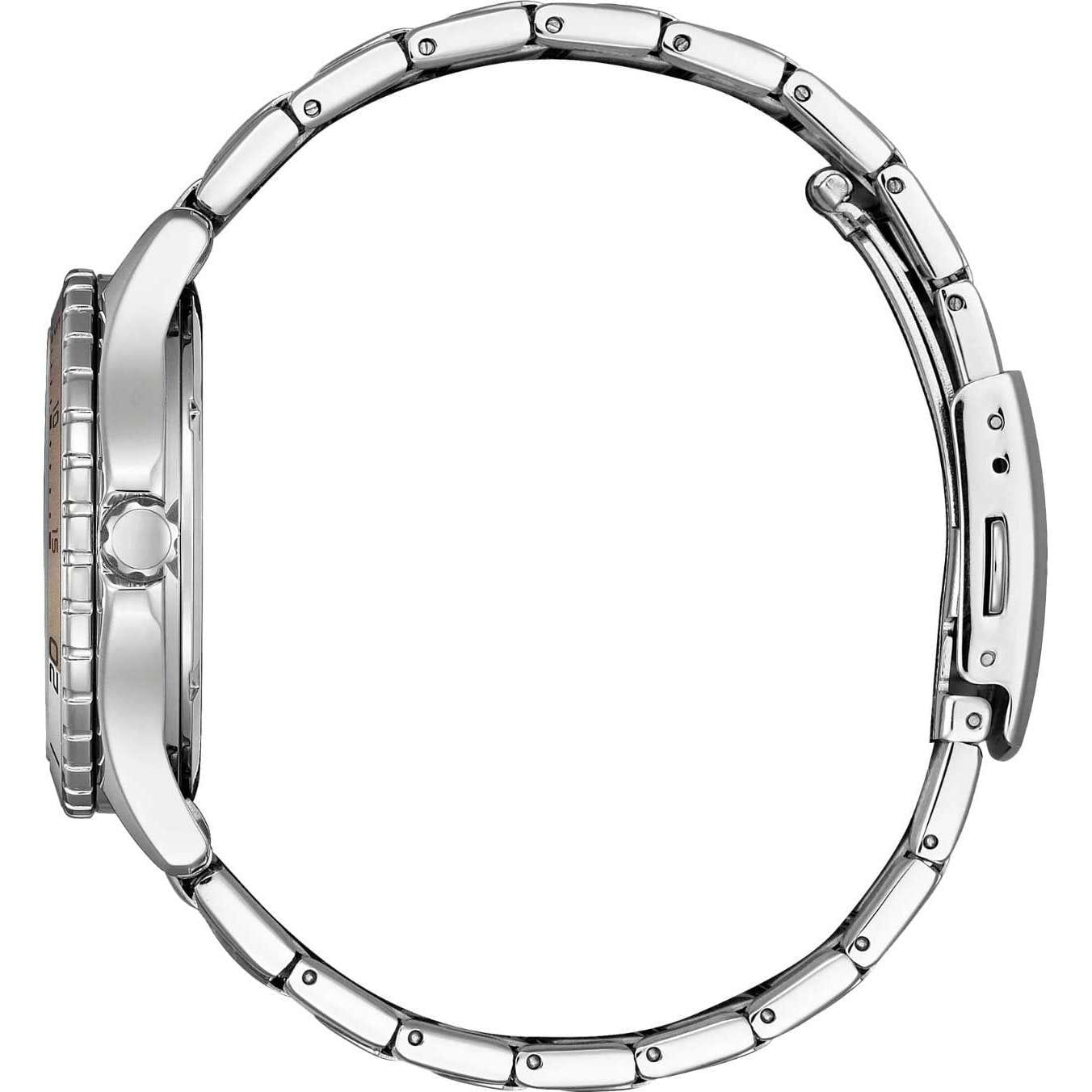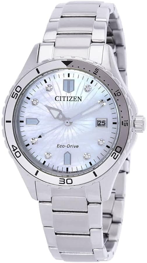 Элегантные женские часы Citizen FE6170-88D станут ярким акцентом любого образа благодаря современному дизайну и высокому качеству исполнения. Корпус диаметром 36,8 мм и толщиной 9,8 мм выполнен из прочной нержавеющей стали, что гарантирует долговечность и надежность. Особое внимание привлекает перламутровый циферблат, украшенный сверкающими кристаллами в виде часовых меток, что придаёт модели утончённый и изысканный вид. Кварцевый механизм с калибром Citizen J810 работает на инновационной системе Eco-Drive — часы заряжаются от любого источника света, обеспечивая запас хода до 240 дней и не требуя замены батарейки. Функции индикации заряда EOLEOLПредставляет собой систему, уведомляющую владельца часов о необходимости замены элемента питания. За 2 недели до полного разряда батарейки секундная стрелка перестаёт ходить чётко и начинает перепрыгивать на 3-4 деления. и предотвращения перезарядки обеспечивают дополнительное удобство в использовании. Окошко даты расположено на отметке 3 часа для быстрого просмотра текущего числа. Прочное минеральное стеклоМинеральное стеклоМинеральное стекло представляет собой искусственно выращенный минерал кварца. Такое стекло отличается особой устойчивостью к повреждениям и царапинам. Уступает по некоторым качествам сапфировому стеклу. защищает циферблат от случайных царапин, а водозащита уровня 100WR позволяет использовать часы даже во время плавания. А безельБезельВнешний ободок, закрепляющий стекло. В спортивных часах так называется поворотное кольцо с делениями на циферблате, выполняет роль таймера – замеряет отрезки времени на шкале. Неподвижный безель – элемент декора. Однонаправленно вращающийся безель на дайверских часах позволяет фиксировать моменты погружения и выныривания на поверхность. часов с частичным IP-покрытиемIP-покрытиеМетод ионного напыления. Демонстрирует повышенную устойчивость к истиранию, окислению и химическим веществам. Под воздействием высокого давления и температуры около 1500°C молекулы металла надёжно соединяются с частицами корпуса часов. вращается в одном направлении. Стрелки с люминесцентным покрытиемЛюминесцентное покрытиеПозволяет считывать показания времени в темноте. Производители наносят на стрелки, часовые индексы, безель или поверхность циферблата светонакопительный состав, дающий холодное свечение. обеспечивают отличную читаемость времени даже в темное время суток. Стальной браслет с раскладной застёжкойРаскладная застёжкаТакой тип застёжки используется только на браслетах из металла. Она никогда не раскрывается полностью, происходит разделение на 2 и более частей. Раскладывающая застёжка снизит вероятность потери часов к минимуму. обеспечивает комфортное и надежное крепление на запястье. Модель произведена в Японии и отличается высоким стандартом качества.