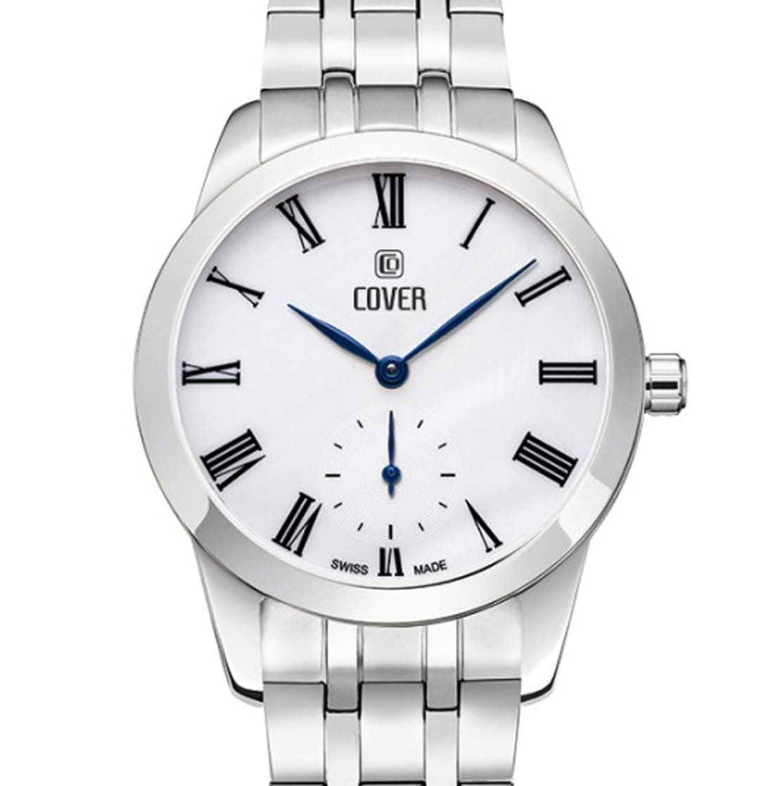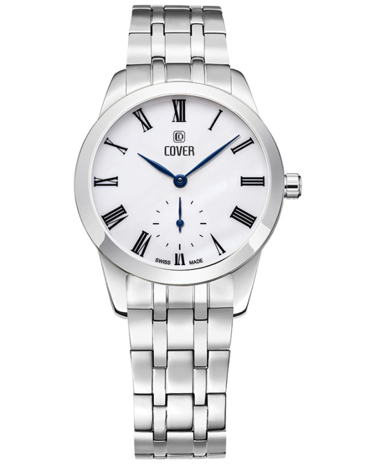 Часы  Cover Nobila CO195.07  - это аксессуар для истинных леди из коллекции Nobila. Часы работают на кварцевом калибре Ronda. Белый циферблат украшен печатными римскими цифрами и субдиском малой секундной стрелки на «6 часах» и защищен минеральным стекломМинеральное стеклоМинеральное стекло представляет собой искусственно выращенный минерал кварца. Такое стекло отличается особой устойчивостью к повреждениям и царапинам. Уступает по некоторым качествам сапфировому стеклу. с сапфировым напылением. Корпус из нержавеющей стали диаметром 32 мм с широким полированным безелемБезельВнешний ободок, закрепляющий стекло. В спортивных часах так называется поворотное кольцо с делениями на циферблате, выполняет роль таймера – замеряет отрезки времени на шкале. Неподвижный безель – элемент декора. Однонаправленно вращающийся безель на дайверских часах позволяет фиксировать моменты погружения и выныривания на поверхность..  Интегрированный браслет состоит из 5 звеньев, на раскладной застёжкеРаскладная застёжкаТакой тип застёжки используется только на браслетах из металла. Она никогда не раскрывается полностью, происходит разделение на 2 и более частей. Раскладывающая застёжка снизит вероятность потери часов к минимуму.. Часы имеют маркировку «Swiss Made».