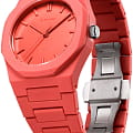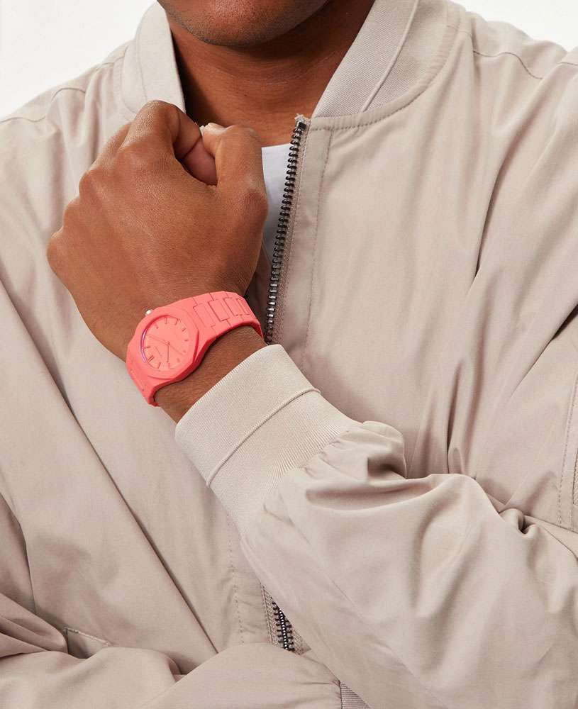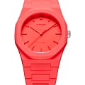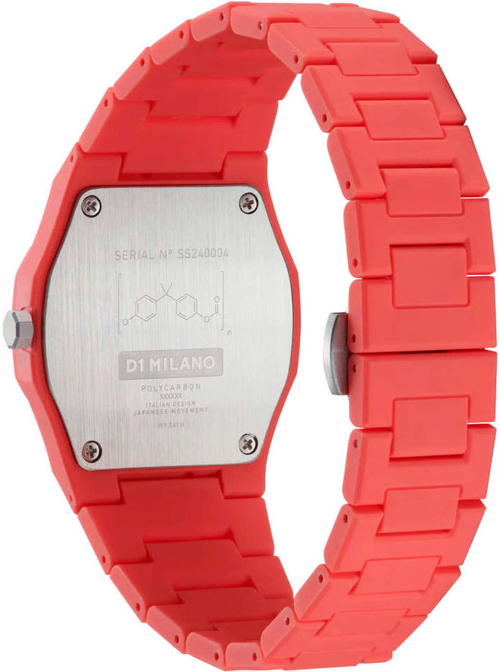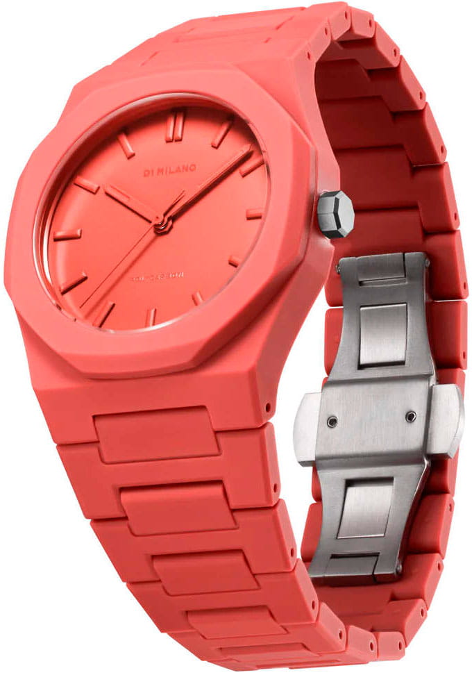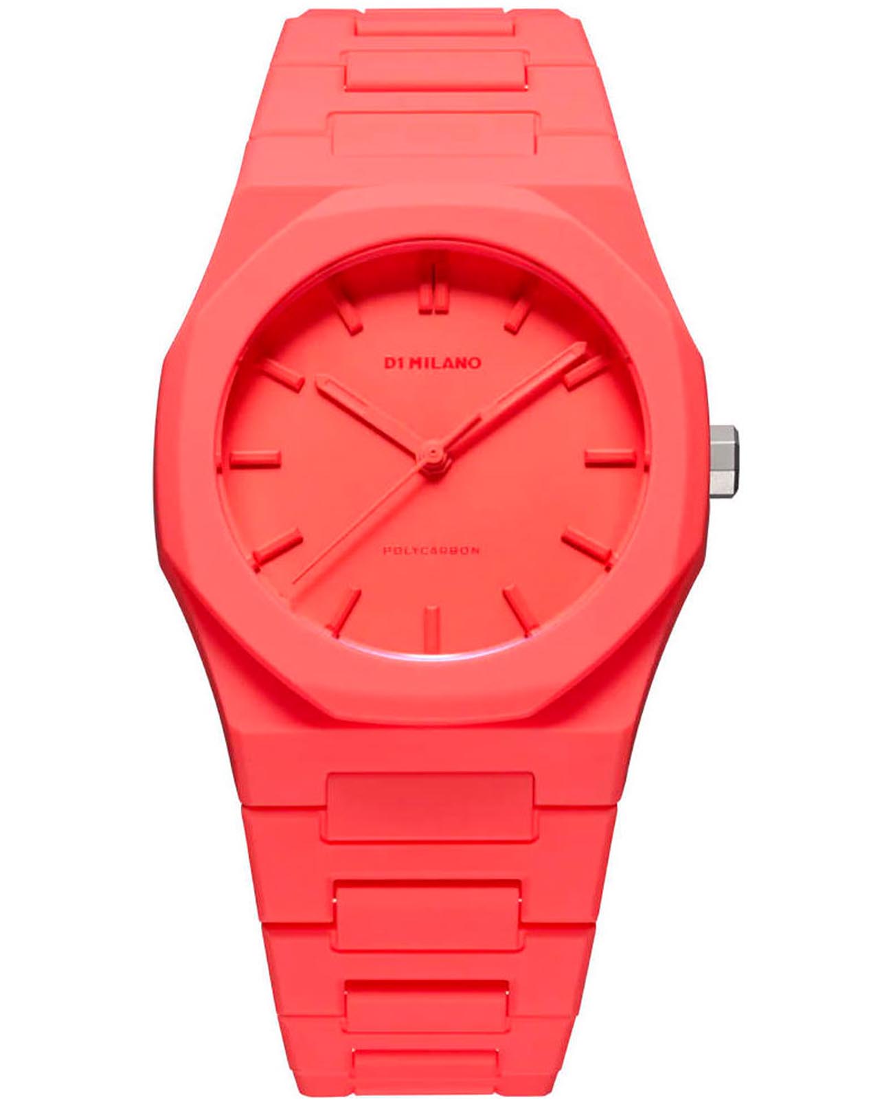 Часы D1 Milano Polycarbon PCBU05 – молодежные часы в стиле унисекс для повседневных образов, стильные и комфортные. Модель Coral имеет коралловый корпус и браслет из поликарбоната с покрытием Софт-Тач.. Циферблат лаконичный с индексами в виде штрихов, защищен минеральным стекломМинеральное стеклоМинеральное стекло представляет собой искусственно выращенный минерал кварца. Такое стекло отличается особой устойчивостью к повреждениям и царапинам. Уступает по некоторым качествам сапфировому стеклу. с антибликовым покрытием. Стальная задняя крышка на 4 винтах. Пластиковый браслет на застёжке «бабочка» с кнопкамиЗастёжка "бабочка"Такой вид застёжки дополняется предохранителями, помогающими избежать случайного раскрытия браслета. Обладают изящным исполнением. .