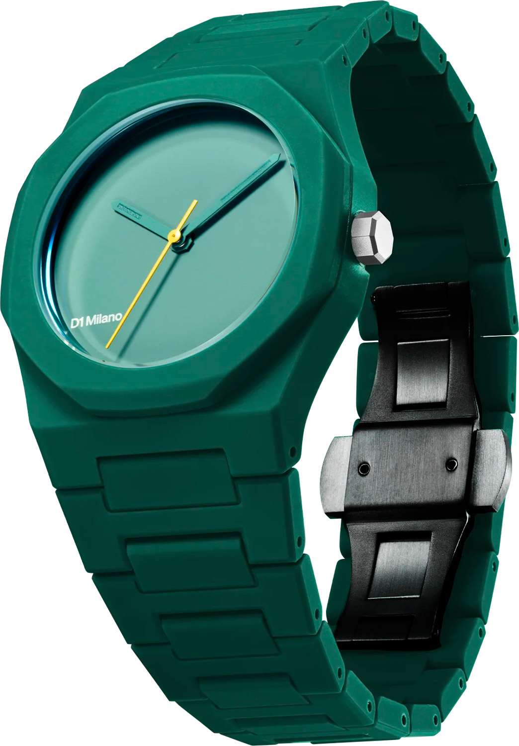 Часы D1 Milano Polycarbon PCBU10 – молодежные часы в стиле унисекс для повседневных образов, стильные и комфортные. Модель имеет зеленый корпус и браслет из поликарбоната с покрытием Софт-Тач.. Циферблат лаконичный с индексами в виде штрихов, защищен минеральным стекломМинеральное стеклоМинеральное стекло представляет собой искусственно выращенный минерал кварца. Такое стекло отличается особой устойчивостью к повреждениям и царапинам. Уступает по некоторым качествам сапфировому стеклу. с антибликовым покрытием. Стальная задняя крышка на 4 винтах. Пластиковый браслет на застёжке-бабочке с кнопкамиЗастёжка "бабочка"Такой вид застёжки дополняется предохранителями, помогающими избежать случайного раскрытия браслета. Обладают изящным исполнением. .