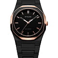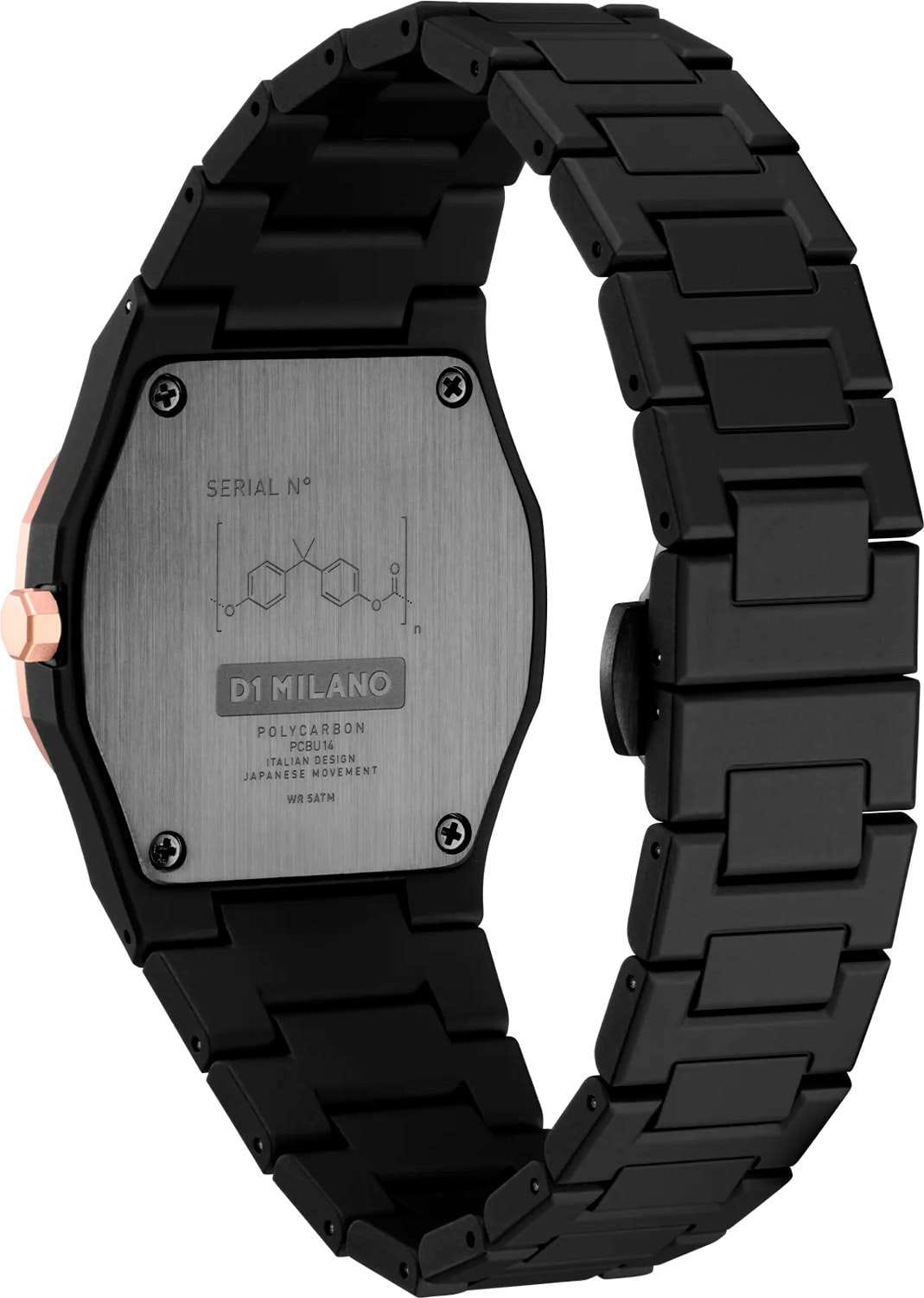 Часы D1 Milano Polycarbon PCBU14 – современные часы в стиле унисекс для повседневных образов. Модель Gold Mesh имеет черный корпус из поликарбоната с покрытием Софт-Тач и полированный стальной безельБезельВнешний ободок, закрепляющий стекло. В спортивных часах так называется поворотное кольцо с делениями на циферблате, выполняет роль таймера – замеряет отрезки времени на шкале. Неподвижный безель – элемент декора. Однонаправленно вращающийся безель на дайверских часах позволяет фиксировать моменты погружения и выныривания на поверхность. с розовым PVD-покрытиемPVDУльтратонкое покрытие наносится в технике вакуумного напыления, сочетает в себе нитрид титана особой прочности со слоем золота или оксида хрома. Несёт в себе декоративную или защитную функцию. и черной эмалью. Циферблат лаконичный с индексами в виде штрихов, защищен минеральным стекломМинеральное стеклоМинеральное стекло представляет собой искусственно выращенный минерал кварца. Такое стекло отличается особой устойчивостью к повреждениям и царапинам. Уступает по некоторым качествам сапфировому стеклу. с антибликовым покрытием. Стальная задняя крышка на 4 винтах. Пластиковый браслет из поликарбоната с покрытием Софт-Тач на застёжке-бабочке с кнопкамиЗастёжка "бабочка"Такой вид застёжки дополняется предохранителями, помогающими избежать случайного раскрытия браслета. Обладают изящным исполнением. . Для тех, кто умеет ценить индивидуальность.