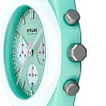 Часы D1 Milano PHBJ02 — это элегантные кварцевые часы, которые впечатляют своим функциональным дизайном, подходят как для мужчин, так и для женщин. Их высокая надежность превращает эти часы в незаменимый аксессуар на каждый день. ХронографХронографФункция позволяет измерять отрезки времени с особой точностью: часы, минуты, секунды. Верным признаком хронографа является наличие на циферблате 3 дополнительных окошек-счётчиков. оснащен секундомеромСекундомерСекундоме́р — прибор, способный измерять интервалы времени с точностью до долей секунды. и зеленым циферблатом, защищенным минеральным стекломМинеральное стеклоМинеральное стекло представляет собой искусственно выращенный минерал кварца. Такое стекло отличается особой устойчивостью к повреждениям и царапинам. Уступает по некоторым качествам сапфировому стеклу.. На циферблате расположены накладные метки в виде штрихов и три дополнительных циферблата с розовыми стрелками, а также окошко календаря в районе отметки 6 часов. Пластиковый белый безельБезельВнешний ободок, закрепляющий стекло. В спортивных часах так называется поворотное кольцо с делениями на циферблате, выполняет роль таймера – замеряет отрезки времени на шкале. Неподвижный безель – элемент декора. Однонаправленно вращающийся безель на дайверских часах позволяет фиксировать моменты погружения и выныривания на поверхность. отлично сочетается с зеленым пластиковым браслетом, застежкой «бабочка»Застёжка "бабочка"Такой вид застёжки дополняется предохранителями, помогающими избежать случайного раскрытия браслета. Обладают изящным исполнением. . Стальная задняя крышка этих часов крепится на 4-х винтах. Водонепроницаемость до 50 метров делает эти часы идеальным выбором для повседневного использования.