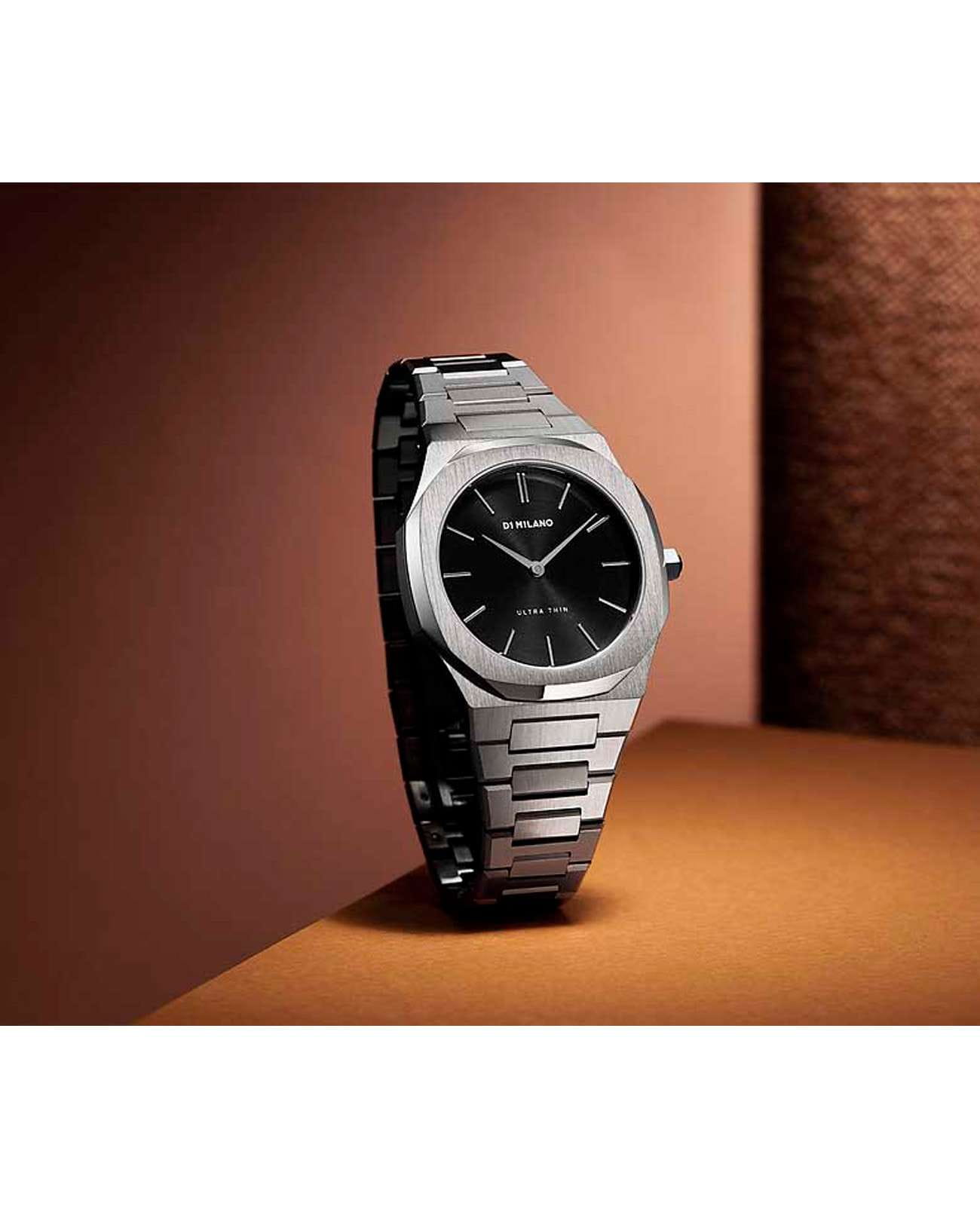 Женские наручные часы D1 Milano UTBL05 из коллекции Ultra Thin сочетают в себе элегантный дизайн и современные технологии. Модель обладает круглым корпусом диаметром 34 мм, изготовленным из высококачественной нержавеющей стали 316L, что обеспечивает устойчивость к внешним воздействиям. Толщина ультратонкого корпуса составляет всего 6 мм, делая аксессуар легким и удобным для повседневного использования. Браслет также выполнен из нержавеющей стали с раскладной застежкойРаскладной замокДанный вариант застежки используется только на часах с металлическим браслетом. Отличительная особенность такого крепления в том, что длина браслета становится универсальной и вы можете самостоятельно отрегулировать нужный вам размер – застежка просто двигается по браслету часов., гарантирующей комфортное ношение и безопасность. Черный циферблат украшен метками в виде штрихов и оснащен стрелочным механизмом, который подчеркивает элегантность модели. Для защиты используется сапфировое стеклоСапфировое стеклоПрочный и надёжный материал из кристалла сапфира синтетического происхождения, характеризующийся особой твёрдостью и устойчивостью к царапинам и повреждениям. с антибликовым покрытиемАнтибликовое покрытиеСлой оксида металла в 0,13-0,3 микрон, благодаря которому стекло часов не бликует и не отражает свет. Антибликовое покрытие уменьшает отражение света в 10 раз, обеспечивая отличную читаемость показателей циферблата., обеспечивающее прочную защиту от царапин и бликов. Часы работают на кварцевом механизме, гарантирующем точность хода без необходимости регулярного подзавода. Водонепроницаемость часов достигает 5 атмосфер (50 метров), что позволяет использовать их во время мытья рук или плавания, однако не рекомендуется для глубоководного дайвинга.