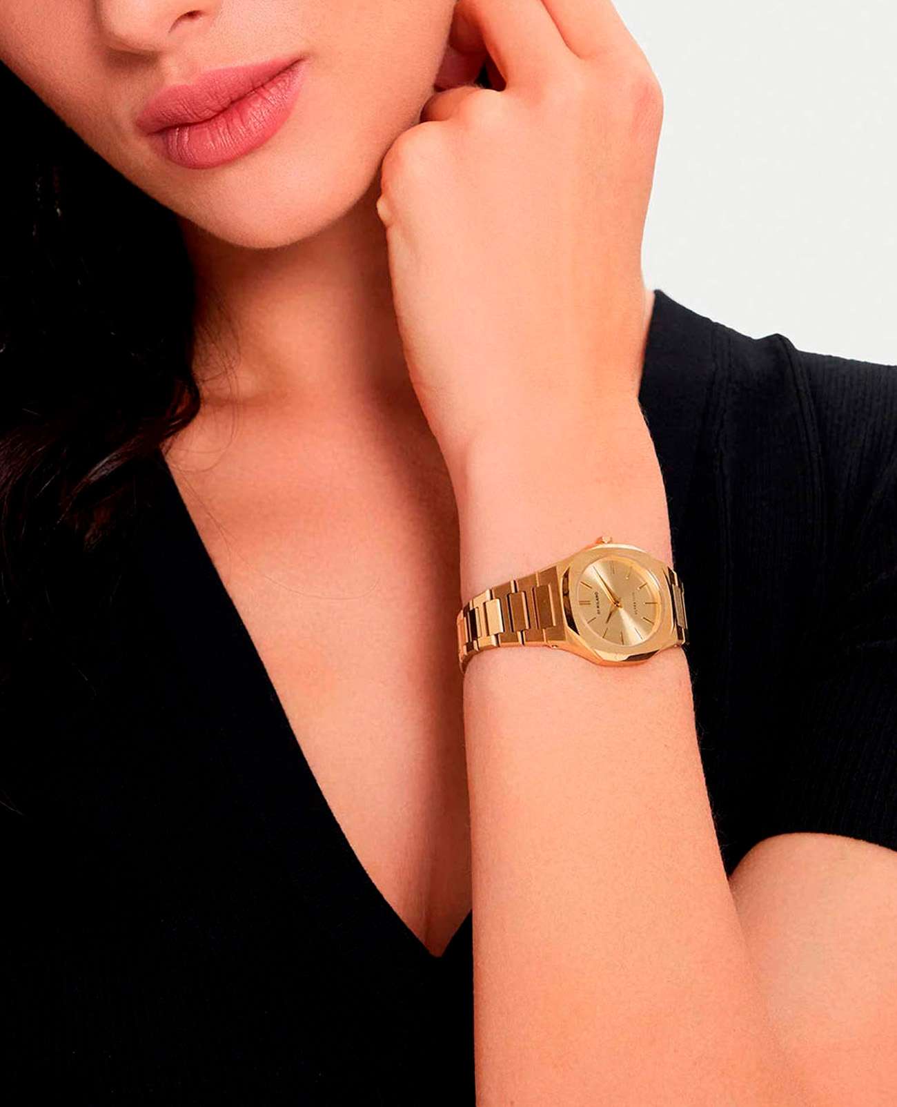 Наручные часы D1 Milano UTBL31 из коллекции Ultra Thin сочетают в себе элегантный дизайн и современные технологии. Модель обладает круглым корпусом диаметром 30 мм, изготовленным из нержавеющей стали с PVD-покрытиемPVDУльтратонкое покрытие наносится в технике вакуумного напыления, сочетает в себе нитрид титана особой прочности со слоем золота или оксида хрома. Несёт в себе декоративную или защитную функцию. золотого цвета, что обеспечивает высокую устойчивость к внешним воздействиям. Для защиты циферблата используется сапфировое стеклоСапфировое стеклоПрочный и надёжный материал из кристалла сапфира синтетического происхождения, характеризующийся особой твёрдостью и устойчивостью к царапинам и повреждениям. с антибликовым покрытиемАнтибликовое покрытиеСлой оксида металла в 0,13-0,3 микрон, благодаря которому стекло часов не бликует и не отражает свет. Антибликовое покрытие уменьшает отражение света в 10 раз, обеспечивая отличную читаемость показателей циферблата., которое эффективно противостоит царапинам и механическим повреждениям. Часы оснащены кварцевым механизмом Miyota 1L22, гарантирующим точное время без необходимости подзаводки. Водонепроницаемость модели достигает 5 атмосфер (50 метров), что позволяет использовать их при контакте с водой, например, во время мытья рук или дождя. Браслет выполнен из нержавеющей стали с PVD-покрытиемPVDУльтратонкое покрытие наносится в технике вакуумного напыления, сочетает в себе нитрид титана особой прочности со слоем золота или оксида хрома. Несёт в себе декоративную или защитную функцию. и с раскладной застежкойРаскладной замокДанный вариант застежки используется только на часах с металлическим браслетом. Отличительная особенность такого крепления в том, что длина браслета становится универсальной и вы можете самостоятельно отрегулировать нужный вам размер – застежка просто двигается по браслету часов., обеспечивающей комфортное ношение и безопасность. Циферблат с узором Light Sunray (Soleil) в золотом цвете придает часам особую изысканность и делает их идеальным выбором для повседневного использования или особых случаев.