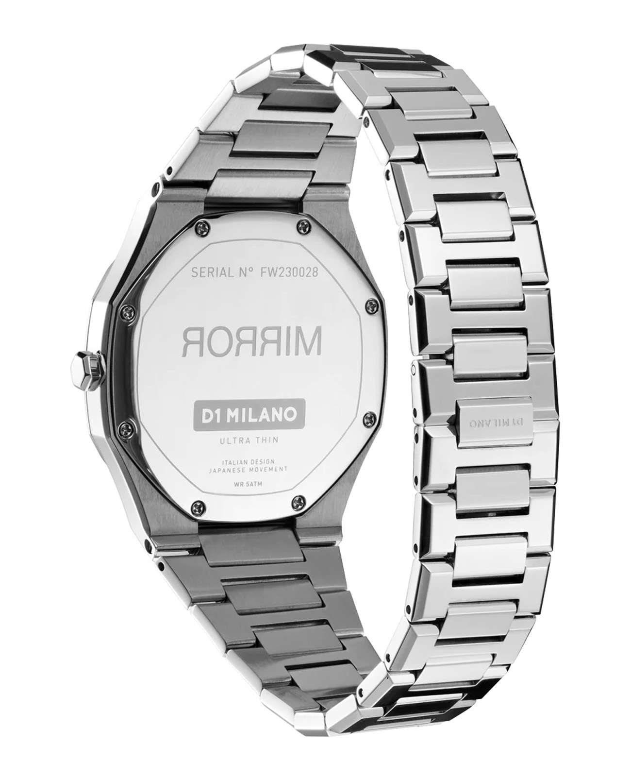 Наручные часы D1 Milano UTBU07 из коллекции Ultra Thin сочетают в себе современный дизайн и инновационные технологии. Модель обладает корпусом диаметром 38 мм, выполненным из нержавеющей стали с полированной отделкой, что подчеркивает элегантность и минимализм дизайна. Циферблат зеркального типа украшен лаконичными метками, создавая эффектный и запоминающийся образ. Защиту циферблата обеспечивает сапфировое стеклоСапфировое стеклоПрочный и надёжный материал из кристалла сапфира синтетического происхождения, характеризующийся особой твёрдостью и устойчивостью к царапинам и повреждениям. с антибликовым покрытиемАнтибликовое покрытиеСлой оксида металла в 0,13-0,3 микрон, благодаря которому стекло часов не бликует и не отражает свет. Антибликовое покрытие уменьшает отражение света в 10 раз, обеспечивая отличную читаемость показателей циферблата., известное своей устойчивостью к царапинам и высокой прозрачностью. Часы оснащены кварцевым механизмом Miyota 1L22, гарантирующим точность хода без необходимости подзаводки. Браслет выполнен из нержавеющей стали с полированной отделкой, что обеспечивает комфортное ношение на протяжении всего дня. Водонепроницаемость модели составляет 50 метров, что позволяет использовать часы в повседневной жизни, включая контакт с водой при мытье рук или дожде, однако не рекомендуется для погружений или активных водных видов спорта. Изготовленные в Италии, эти ультратонкие часы станут стильным аксессуаром, идеально дополняющим как деловой, так и casual-образ.
