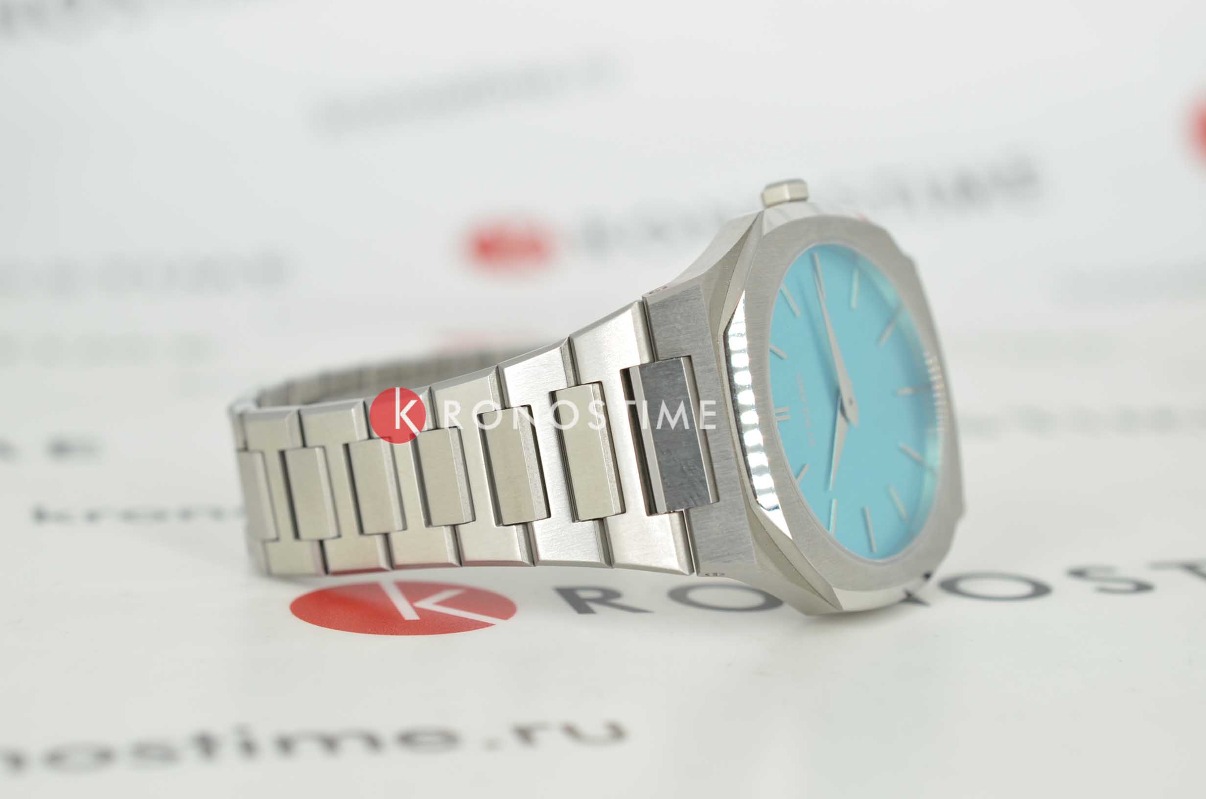 Наручные часы D1 Milano UTBU08 из коллекции Ultra Thin сочетают в себе современный дизайн и инновационные технологии. Модель обладает круглым корпусом диаметром 38 мм, выполненным из нержавеющей стали, что обеспечивает высокую устойчивость к внешним воздействиям. Циферблат светло-голубого цвета с текстурой "лен" создает элегантный и запоминающийся образ, подчеркивая уникальность модели среди других часов. Защиту циферблата обеспечивает сапфировое стеклоСапфировое стеклоПрочный и надёжный материал из кристалла сапфира синтетического происхождения, характеризующийся особой твёрдостью и устойчивостью к царапинам и повреждениям., известное своей устойчивостью к царапинам и высокой прозрачностью. Часы оснащены кварцевым механизмом Miyota 1L22, гарантирующим точность хода без необходимости подзаводки. Браслет выполнен из нержавеющей стали с полированной и матовой отделкой на раскладной застёжкеРаскладная застёжкаТакой тип застёжки используется только на браслетах из металла. Она никогда не раскрывается полностью, происходит разделение на 2 и более частей. Раскладывающая застёжка снизит вероятность потери часов к минимуму., что обеспечивает комфортное ношение на протяжении всего дня. Водонепроницаемость модели составляет 50 метров, что позволяет использовать часы в повседневной жизни, включая контакт с водой при мытье рук или дожде, однако не рекомендуется для погружений или активных водных видов спорта. Изготовленные в Италии, эти ультратонкие часы станут стильным аксессуаром, идеально дополняющим как деловой, так и casual-образ.