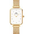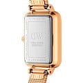 Женские наручные часы с минеральным стекломМинеральное стеклоМинеральное стекло представляет собой искусственно выращенный минерал кварца. Такое стекло отличается особой устойчивостью к повреждениям и царапинам. Уступает по некоторым качествам сапфировому стеклу. Daniel Wellington Quadro DW00100599, кварцевый механизм с высокой точностью. Корпус часов изготовлен из стали с PVD-покрытиемPVDУльтратонкое покрытие наносится в технике вакуумного напыления, сочетает в себе нитрид титана особой прочности со слоем золота или оксида хрома. Несёт в себе декоративную или защитную функцию.. Циферблат украшен фирменным логотипом Daniel Wellington и 12 кристаллами Swarovski. Накладные метки в виде штрихов. Рифленая заводная головка. Класс водозащиты: 30 метров, позволит защитить корпус от случайных брызг или капель дождя. Стальной браслет миланского плетения с PVD-покрытиемPVDУльтратонкое покрытие наносится в технике вакуумного напыления, сочетает в себе нитрид титана особой прочности со слоем золота или оксида хрома. Несёт в себе декоративную или защитную функцию. на раскладном замкеРаскладной замокДанный вариант застежки используется только на часах с металлическим браслетом. Отличительная особенность такого крепления в том, что длина браслета становится универсальной и вы можете самостоятельно отрегулировать нужный вам размер – застежка просто двигается по браслету часов..
