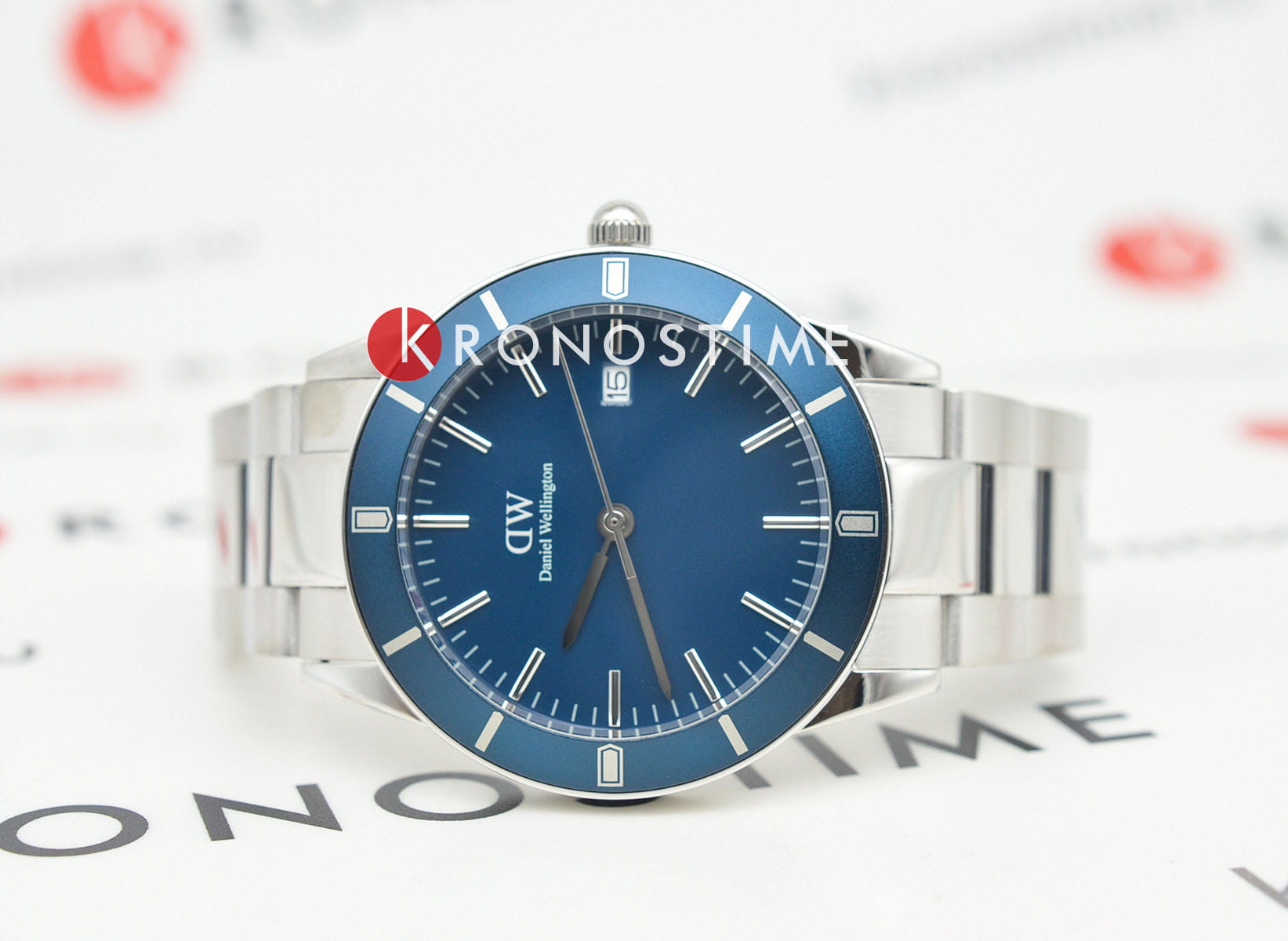 Daniel Wellington — мужские часы в современном спортивно-элегантном стиле. Круглый корпус диаметром 40 мм изготовлен из нержавеющей стали и дополнен синим безелемБезельВнешний ободок, закрепляющий стекло. В спортивных часах так называется поворотное кольцо с делениями на циферблате, выполняет роль таймера – замеряет отрезки времени на шкале. Неподвижный безель – элемент декора. Однонаправленно вращающийся безель на дайверских часах позволяет фиксировать моменты погружения и выныривания на поверхность. из анодированного алюминия, которое придаёт модели выразительный характер.