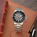 Мужские наручные часы с минеральным стекломМинеральное стеклоМинеральное стекло представляет собой искусственно выращенный минерал кварца. Такое стекло отличается особой устойчивостью к повреждениям и царапинам. Уступает по некоторым качествам сапфировому стеклу. Earnshaw Wallis ES-8227-11, механический механизм с автоподзаводом. Класс водозащиты: 50 метров, позволит защитить корпус от случайных брызг или капель дождя. Корпус часов изготовлен из стали. Центральные часовая, минутная и секундная стрелки. Отображение даты в малом циферблате. Фазы Луны. Черный циферблат с открытым балансом хода. Круглый корпус выполнен из нержавеющей стали. Раскладная застёжкаРаскладная застёжкаТакой тип застёжки используется только на браслетах из металла. Она никогда не раскрывается полностью, происходит разделение на 2 и более частей. Раскладывающая застёжка снизит вероятность потери часов к минимуму.