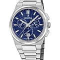 Мужские кварцевые часы Festina из коллекции Rivé — это элегантный аксессуар с швейцарским качеством и функциональным дизайном. Корпус диаметром 42,5 мм и толщиной 12 мм выполнен из нержавеющей стали серебряного цвета. Циферблат тёмно-синего цвета дополнен малым циферблатом для секунд и окошком даты в положении 3 часов. Циферблат защищён сапфировым стекломСапфировое стеклоПрочный и надёжный материал из кристалла сапфира синтетического происхождения, характеризующийся особой твёрдостью и устойчивостью к царапинам и повреждениям.. Стрелки с люминесцентным покрытиемЛюминесцентное покрытиеПозволяет считывать показания времени в темноте. Производители наносят на стрелки, часовые индексы, безель или поверхность циферблата светонакопительный состав, дающий холодное свечение., обеспечивающим хорошую читаемость в темноте. Заводная головка — вытягивающегося типа, задняя крышка — завинчивающаяся. Часы оснащены стальным браслетом на застёжке «бабочка» с кнопкамиЗастёжка "бабочка"Такой вид застёжки дополняется предохранителями, помогающими избежать случайного раскрытия браслета. Обладают изящным исполнением. . Механизм — швейцарский кварцевый калибр Ronda 5030.D с функцией хронографаХронографФункция позволяет измерять отрезки времени с особой точностью: часы, минуты, секунды. Верным признаком хронографа является наличие на циферблате 3 дополнительных окошек-счётчиков.: центральная секундная стрелка, функции сплит и добавления времени. Срок службы батареи — 54 месяца. Водонепроницаемость 100 м позволяет использовать часы для плавания. Универсальный выбор для тех, кто ценит точность, стиль и швейцарское мастерство.