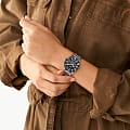 Парный комплект часов Fossil Bannon BQ2753SET, кварцевый механизм с высокой точностью. Минеральное стеклоМинеральное стеклоМинеральное стекло представляет собой искусственно выращенный минерал кварца. Такое стекло отличается особой устойчивостью к повреждениям и царапинам. Уступает по некоторым качествам сапфировому стеклу. устойчивое к мелким механическим повреждениям. Класс водозащиты: 50 метров, позволит защитить корпус от случайных брызг или капель дождя. Корпус часов изготовлен из стали. Стрелки и метки с люминесцентным покрытиемЛюминесцентное покрытиеПозволяет считывать показания времени в темноте. Производители наносят на стрелки, часовые индексы, безель или поверхность циферблата светонакопительный состав, дающий холодное свечение.. Функции даты, дня недели и 24 часового формата времени вынесены на отдельные циферблаты. Ширина корпуса для мужских часов: 45мм, для женских часов: 34мм. Рифленая заводная головка с защитой. Стальной браслет на раскладной застёжкеРаскладная застёжкаТакой тип застёжки используется только на браслетах из металла. Она никогда не раскрывается полностью, происходит разделение на 2 и более частей. Раскладывающая застёжка снизит вероятность потери часов к минимуму. с PVD-покрытиемPVDУльтратонкое покрытие наносится в технике вакуумного напыления, сочетает в себе нитрид титана особой прочности со слоем золота или оксида хрома. Несёт в себе декоративную или защитную функцию.. Ширина браслета для мужских часов: 22мм, для женских часов: 18мм.