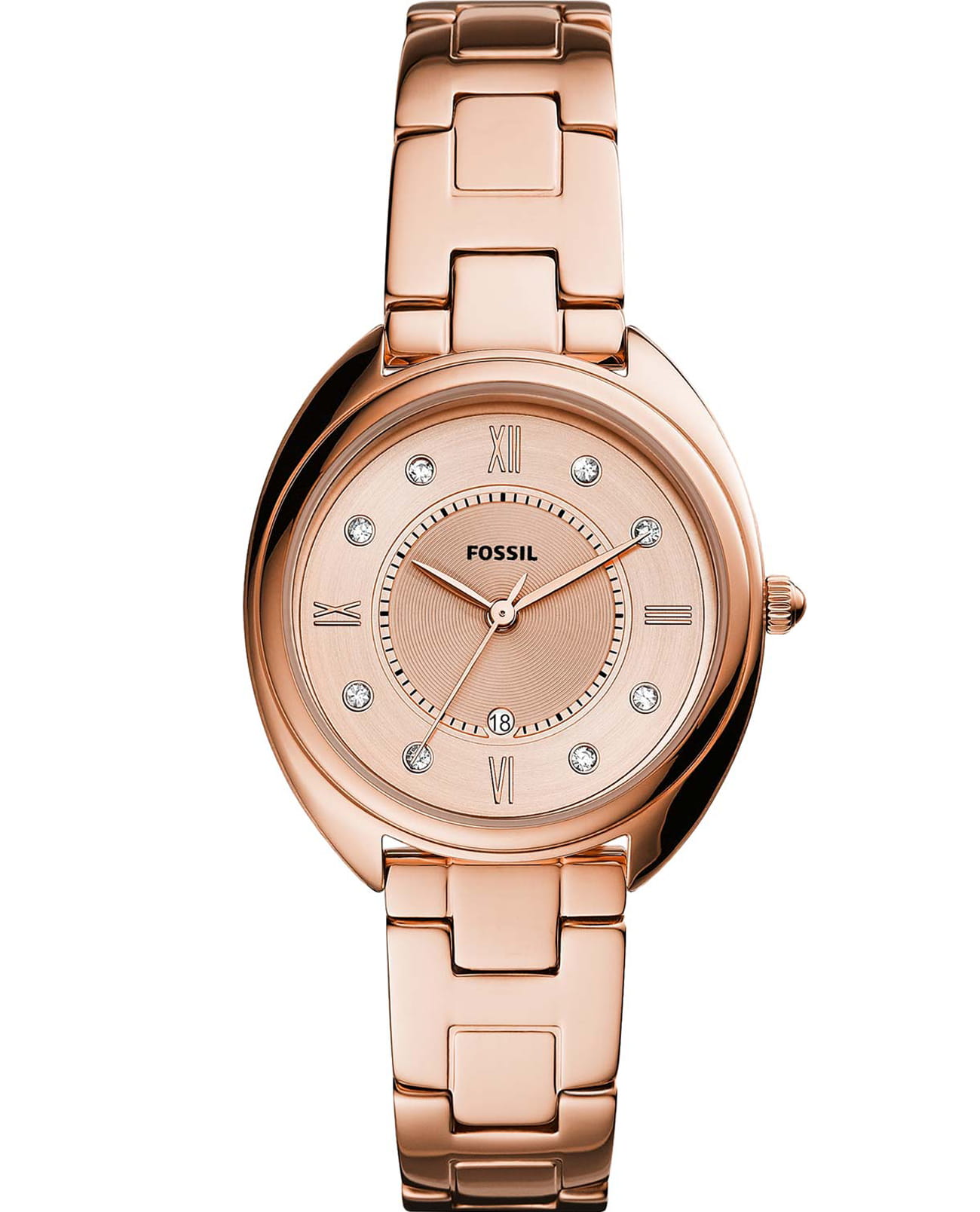 Fossil Gabby ES5070 - кварцевые часы с базовой трёхстрелочной индикацией и датой в положении 6 часов. Корпус 34 мм выполнен из стали с IP-покрытиемIP-покрытиеМетод ионного напыления. Демонстрирует повышенную устойчивость к истиранию, окислению и химическим веществам. Под воздействием высокого давления и температуры около 1500°C молекулы металла надёжно соединяются с частицами корпуса часов. под розовое золото. Водозащита 50WR подходит для повседневного контакта с водой. Розовый циферблат с комбинированной разметкой: римские цифры и точечные метки с кристаллами. Установлено минеральное стеклоМинеральное стеклоМинеральное стекло представляет собой искусственно выращенный минерал кварца. Такое стекло отличается особой устойчивостью к повреждениям и царапинам. Уступает по некоторым качествам сапфировому стеклу., устойчивое к мелким повреждениям. Стальной браслет с покрытием и системой быстрой замены, фиксируется на раскладной застёжкеРаскладная застёжкаТакой тип застёжки используется только на браслетах из металла. Она никогда не раскрывается полностью, происходит разделение на 2 и более частей. Раскладывающая застёжка снизит вероятность потери часов к минимуму..